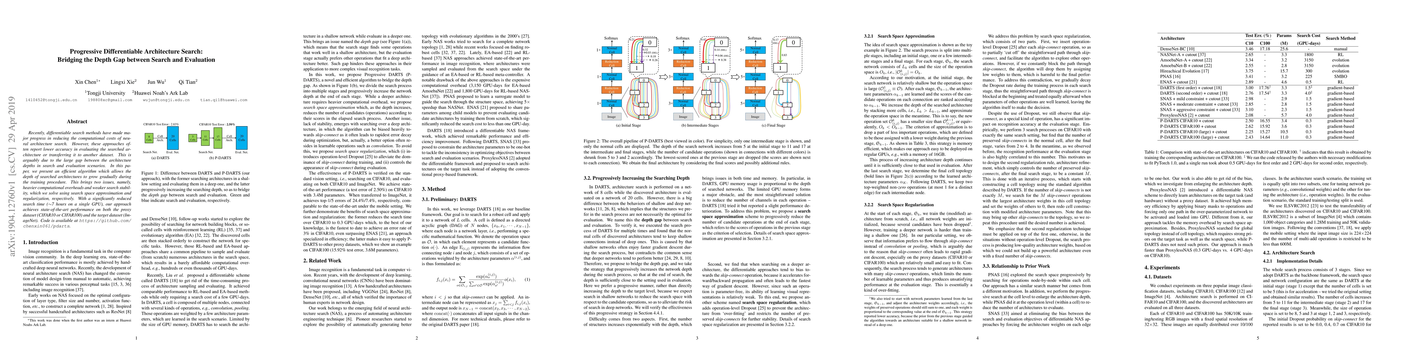This paper proposes a progressive differentiable architecture search method that gradually increases the depth of searched neural architectures during training, addressing the gap between search and evaluation depths. The authors tackle computational overheads and search stability through search space approximation and regularization, achieving state-of-the-art performance on CIFAR10/100 and ImageNet with a reduced search time of 7 hours on a single GPU.