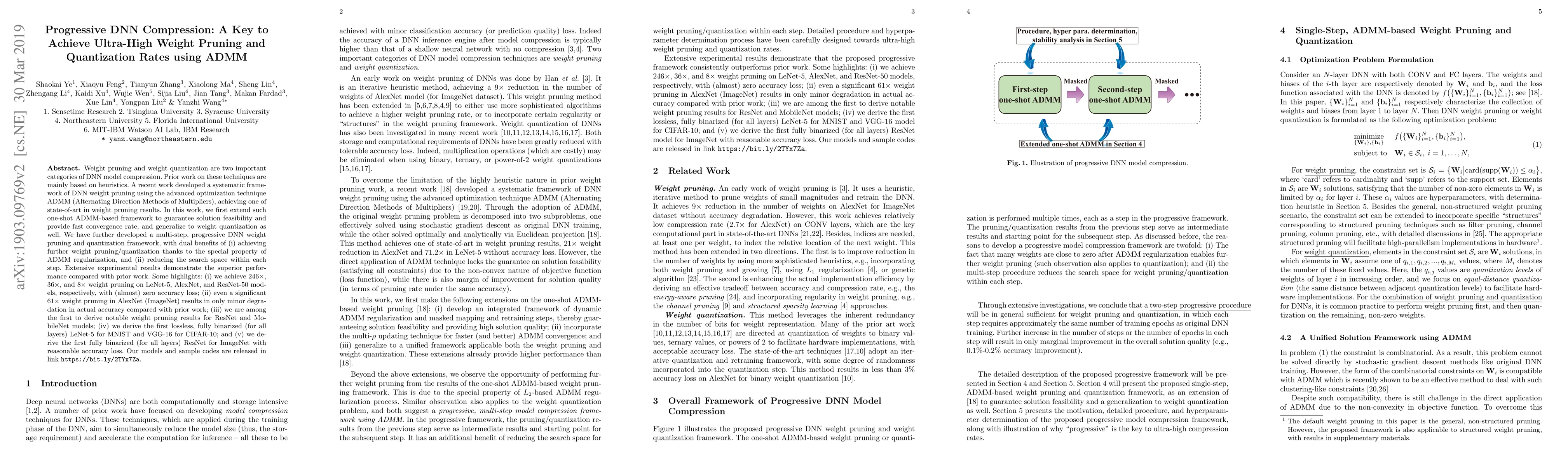 This paper proposes a progressive DNN compression framework using ADMM to achieve ultra-high weight pruning and quantization rates. It extends the ADMM-based framework for better solution feasibility and convergence, achieving significant weight pruning with minimal accuracy loss on various models, including ResNet and MobileNet.