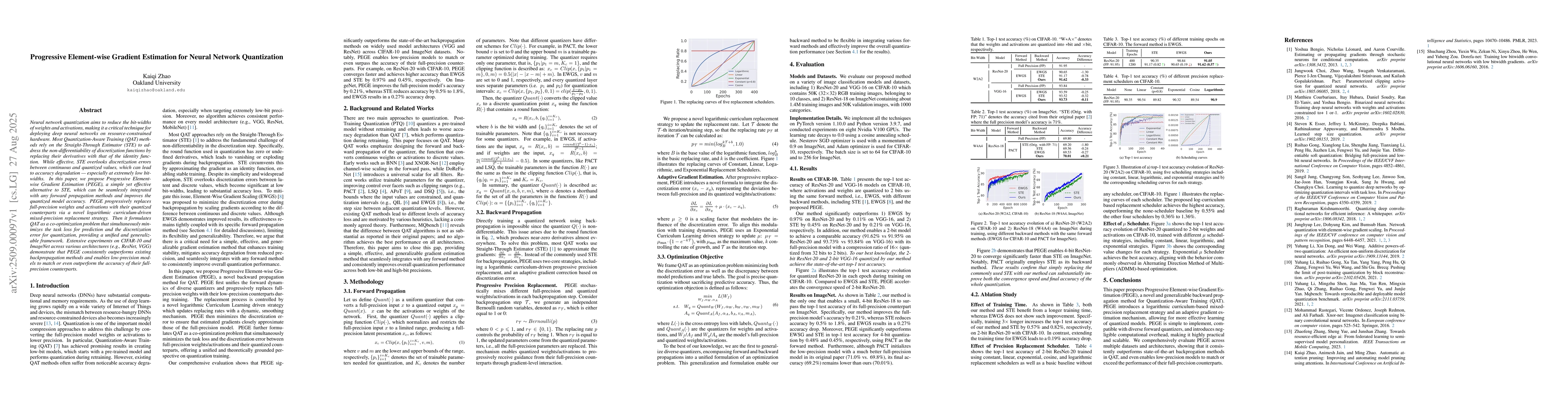 Neural network quantization aims to reduce the bit-widths of weights and activations, making it a critical technique for deploying deep neural networks on resource-constrained hardware. Most Quantization-Aware Training (QAT) methods rely on the Straight-Through Estimator (STE) to address the non-differentiability of discretization functions by replacing their derivatives with that of the identity function. While effective, STE overlooks discretization errors between continuous and quantized values, which can lead to accuracy degradation -- especially at extremely low bit-widths. In this paper, we propose Progressive Element-wise Gradient Estimation (PEGE), a simple yet effective alternative to STE, which can be seamlessly integrated with any forward propagation methods and improves the quantized model accuracy. PEGE progressively replaces full-precision weights and activations with their quantized counterparts via a novel logarithmic curriculum-driven mixed-precision replacement strategy. Then it formulates QAT as a co-optimization problem that simultaneously minimizes the task loss for prediction and the discretization error for quantization, providing a unified and generalizable framework. Extensive experiments on CIFAR-10 and ImageNet across various architectures (e.g., ResNet, VGG) demonstrate that PEGE consistently outperforms existing backpropagation methods and enables low-precision models to match or even outperform the accuracy of their full-precision counterparts.