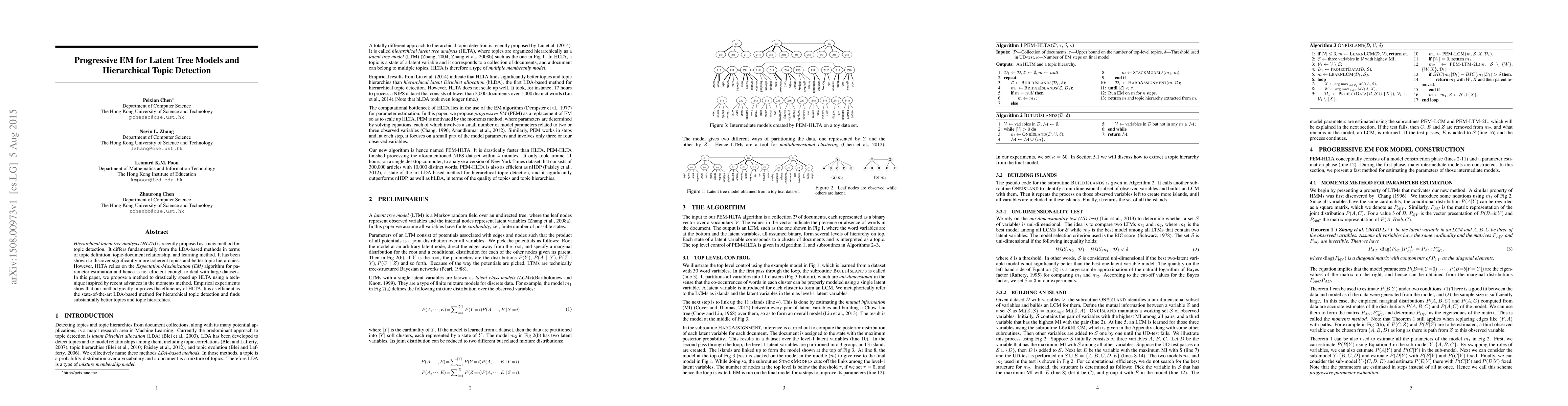 This paper proposes a Progressive EM method to enhance the efficiency of Hierarchical Latent Tree Analysis (HLTA) for topic detection, significantly speeding up parameter estimation compared to traditional EM. The new approach matches the efficiency of LDA-based methods while discovering more coherent topics and better topic hierarchies.