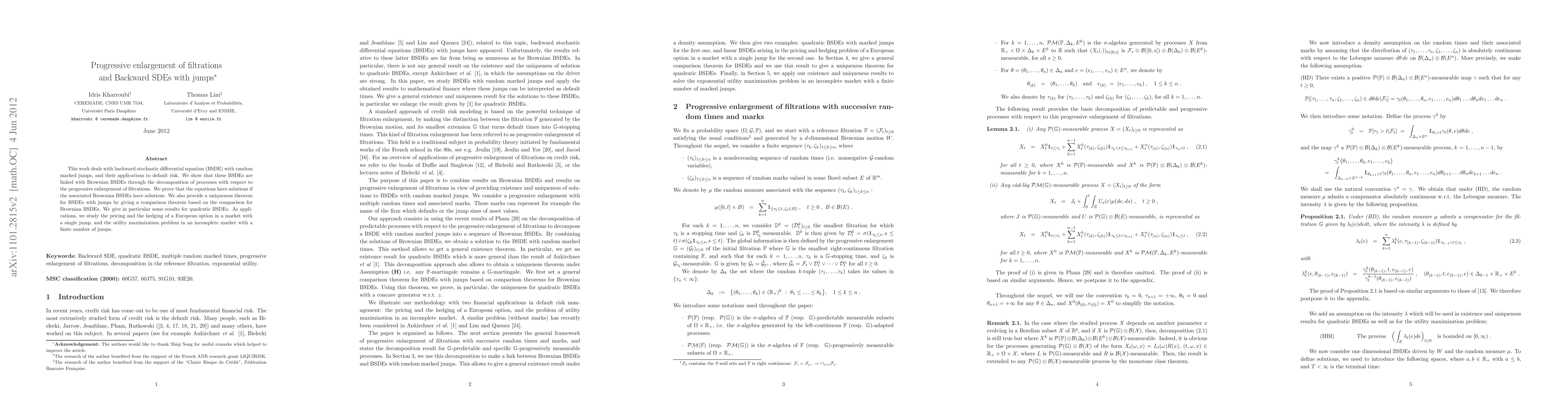 This work deals with backward stochastic differential equation (BSDE) with random marked jumps, and their applications to default risk. We show that these BSDEs are linked with Brownian BSDEs through the decomposition of processes with respect to the progressive enlargement of filtrations. We show that the equations have solutions if the associated Brownian BSDEs have solutions. We also provide a uniqueness theorem for BSDEs with jumps by giving a comparison theorem based on the comparison for Brownian BSDEs. We give in particular some results for quadratic BDSEs. As applications, we study the pricing and the hedging of a European option in a complete market with a single jump, and the utility maximization problem in an incomplete market with a finite number of jumps.