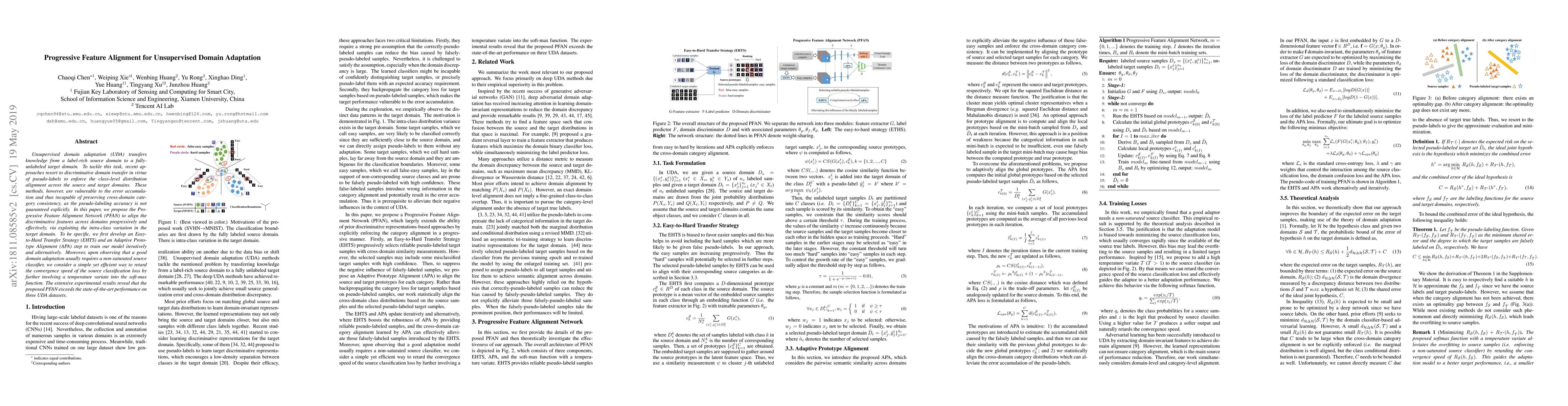 The paper proposes the Progressive Feature Alignment Network (PFAN) to improve unsupervised domain adaptation by progressively aligning discriminative features across domains, using an Easy-to-Hard Transfer Strategy and Adaptive Prototype Alignment. The method also introduces a temperature variate to slow source classifier convergence, achieving state-of-the-art performance on three datasets.