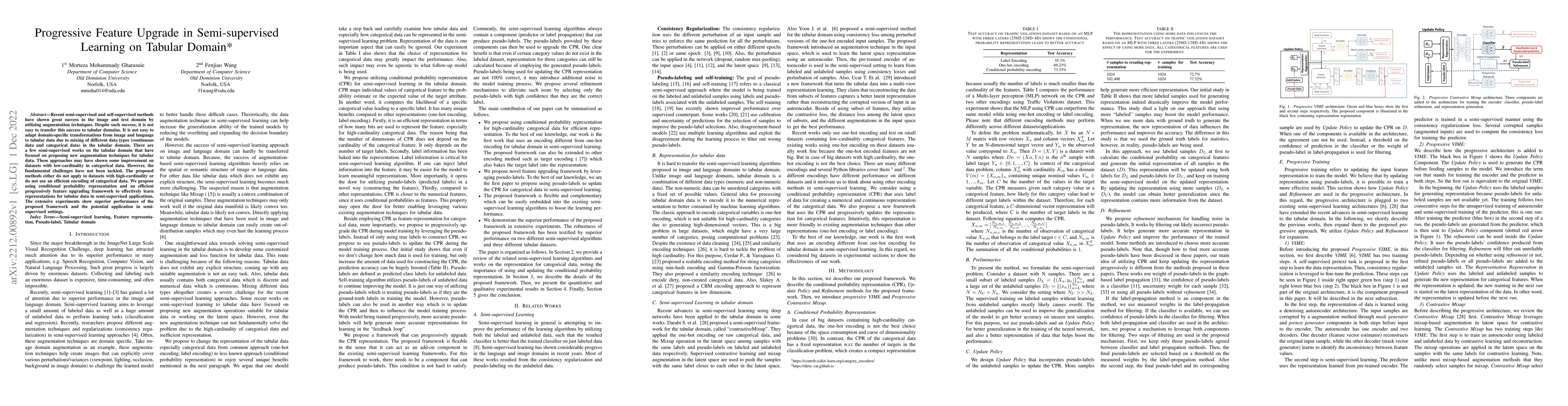 This paper proposes a progressively feature upgrade framework for semi-supervised learning on tabular data, utilizing conditional probability representation and efficient encoding of categorical data to tackle fundamental challenges. The method demonstrates superior performance in experiments, showing potential for semi-supervised applications in tabular domains.