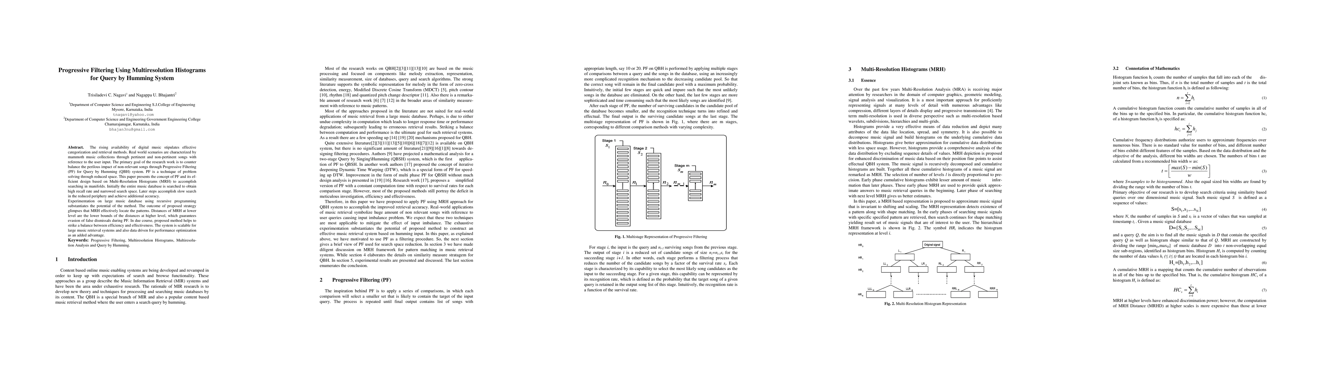 The rising availability of digital music stipulates effective categorization and retrieval methods. Real world scenarios are characterized by mammoth music collections through pertinent and non-pertinent songs with reference to the user input. The primary goal of the research work is to counter balance the perilous impact of non-relevant songs through Progressive Filtering (PF) for Query by Humming (QBH) system. PF is a technique of problem solving through reduced space. This paper presents the concept of PF and its efficient design based on Multi-Resolution Histograms (MRH) to accomplish searching in manifolds. Initially the entire music database is searched to obtain high recall rate and narrowed search space. Later steps accomplish slow search in the reduced periphery and achieve additional accuracy. Experimentation on large music database using recursive programming substantiates the potential of the method. The outcome of proposed strategy glimpses that MRH effectively locate the patterns. Distances of MRH at lower level are the lower bounds of the distances at higher level, which guarantees evasion of false dismissals during PF. In due course, proposed method helps to strike a balance between efficiency and effectiveness. The system is scalable for large music retrieval systems and also data driven for performance optimization as an added advantage.