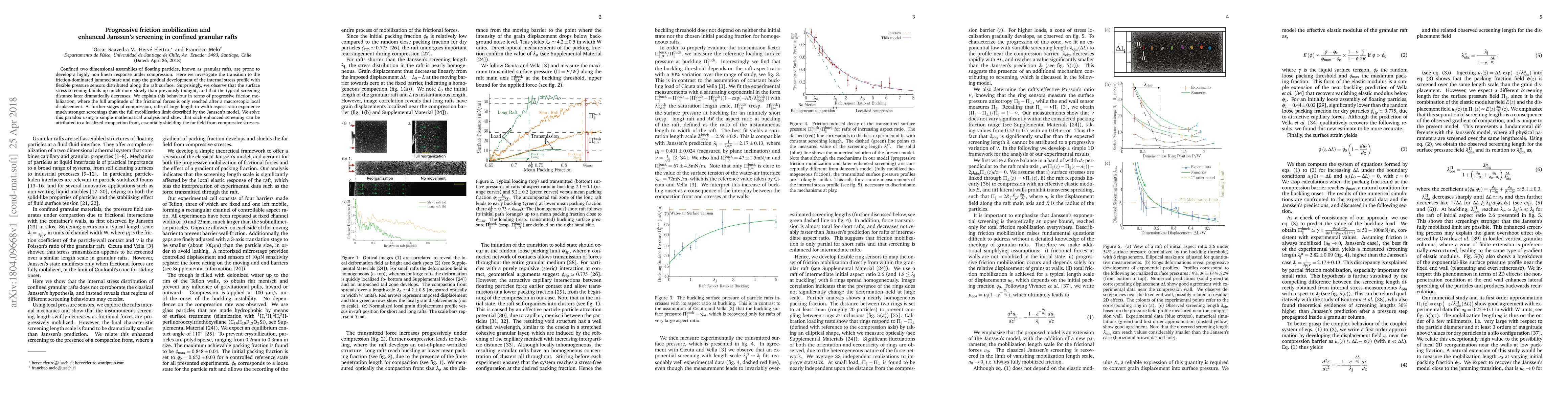 Confined two-dimensional assemblies of floating particles, known as granular rafts, are prone to develop a highly nonlinear response under compression. Here we investigate the transition to the friction-dominated jammed state and map the gradual development of the internal stress profile with flexible pressure sensors distributed along the raft surface. Surprisingly, we observe that the surface stress screening builds up much more slowly than previously thought and that the typical screening distance later dramatically decreases. We explain this behavior in terms of progressive friction mobilization, where the full amplitude of the frictional forces is only reached after a macroscopic local displacement. At further stages of compression, rafts of large length-to-width aspect ratio experience much stronger screenings than the full mobilization limit described by the Janssen's model. We solve this paradox using a simple mathematical analysis and show that such enhanced screening can be attributed to a localized compaction front, essentially shielding the far field from compressive stresses.