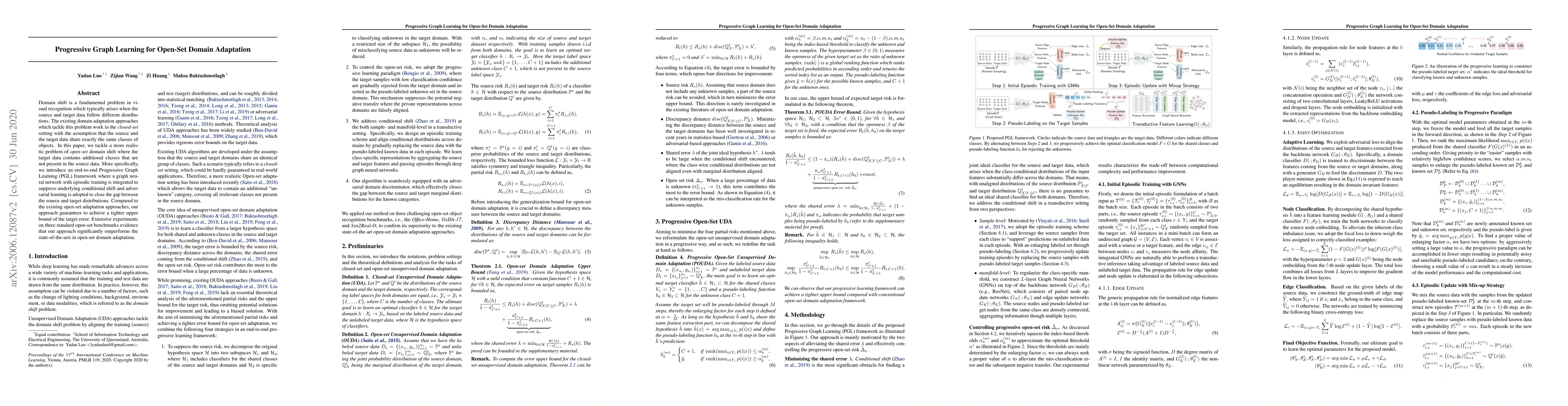 This paper proposes a Progressive Graph Learning (PGL) framework for open-set domain adaptation, addressing the challenge of domain shift when target data includes classes not present in the source data. The approach integrates graph neural networks and adversarial learning to effectively minimize distribution gaps and achieve superior performance compared to existing methods.
