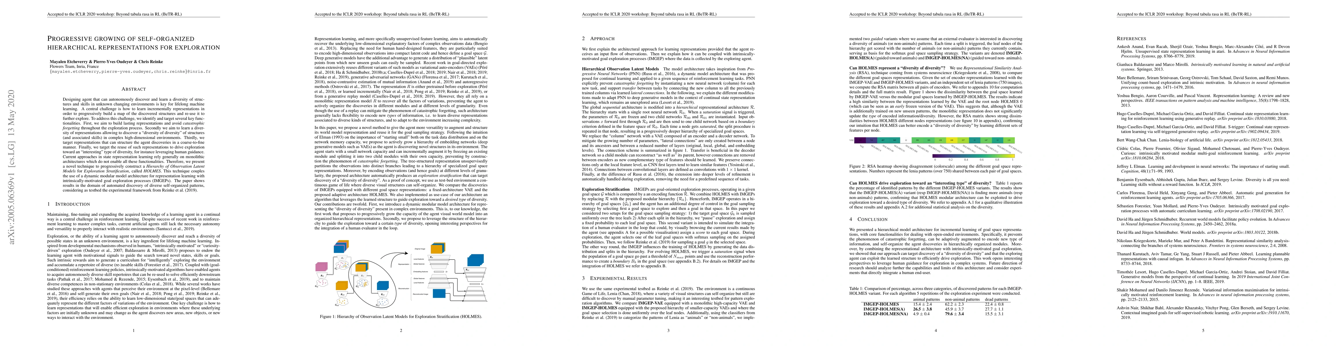 Designing agent that can autonomously discover and learn a diversity of structures and skills in unknown changing environments is key for lifelong machine learning. A central challenge is how to learn incrementally representations in order to progressively build a map of the discovered structures and re-use it to further explore. To address this challenge, we identify and target several key functionalities. First, we aim to build lasting representations and avoid catastrophic forgetting throughout the exploration process. Secondly we aim to learn a diversity of representations allowing to discover a "diversity of diversity" of structures (and associated skills) in complex high-dimensional environments. Thirdly, we target representations that can structure the agent discoveries in a coarse-to-fine manner. Finally, we target the reuse of such representations to drive exploration toward an "interesting" type of diversity, for instance leveraging human guidance. Current approaches in state representation learning rely generally on monolithic architectures which do not enable all these functionalities. Therefore, we present a novel technique to progressively construct a Hierarchy of Observation Latent Models for Exploration Stratification, called HOLMES. This technique couples the use of a dynamic modular model architecture for representation learning with intrinsically-motivated goal exploration processes (IMGEPs). The paper shows results in the domain of automated discovery of diverse self-organized patterns, considering as testbed the experimental framework from Reinke et al. (2019).