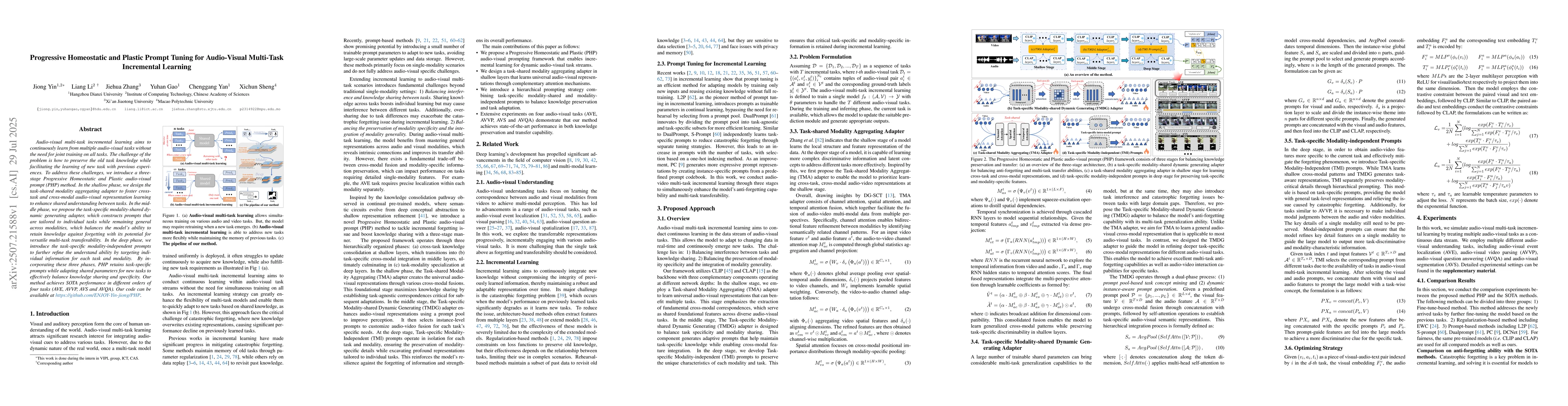 Audio-visual multi-task incremental learning aims to continuously learn from multiple audio-visual tasks without the need for joint training on all tasks. The challenge of the problem is how to preserve the old task knowledge while facilitating the learning of new task with previous experiences. To address these challenges, we introduce a three-stage Progressive Homeostatic and Plastic audio-visual prompt (PHP) method. In the shallow phase, we design the task-shared modality aggregating adapter to foster cross-task and cross-modal audio-visual representation learning to enhance shared understanding between tasks. In the middle phase, we propose the task-specific modality-shared dynamic generating adapter, which constructs prompts that are tailored to individual tasks while remaining general across modalities, which balances the models ability to retain knowledge against forgetting with its potential for versatile multi-task transferability. In the deep phase, we introduce the task-specific modality-independent prompts to further refine the understand ability by targeting individual information for each task and modality. By incorporating these three phases, PHP retains task-specific prompts while adapting shared parameters for new tasks to effectively balance knowledge sharing and specificity. Our method achieves SOTA performance in different orders of four tasks (AVE, AVVP, AVS and AVQA). Our code can be available at https://github.com/ENJOY-Yin-jiong/PHP.