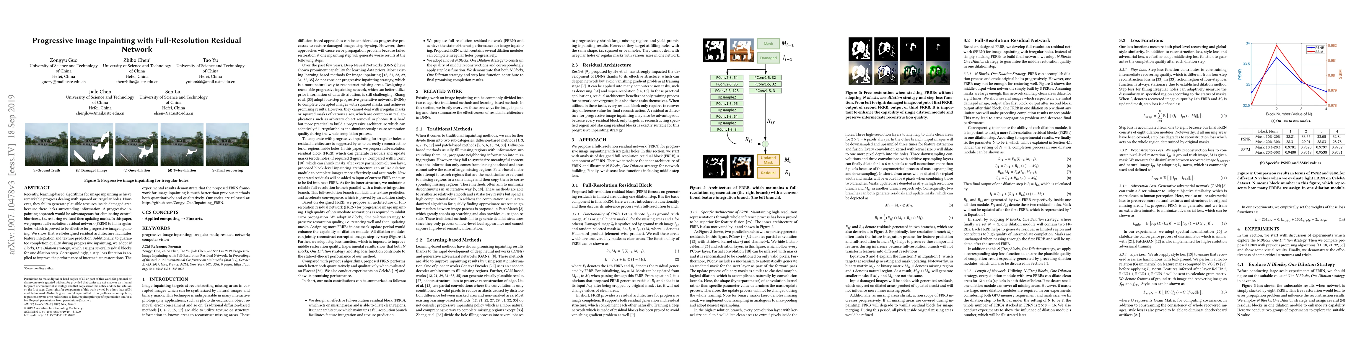 This paper proposes a full-resolution residual network (FRRN) for progressive image inpainting to address the issue of texture generation in damaged areas. The FRRN framework, enhanced with N Blocks, One Dilation strategy and a step loss function, significantly outperforms previous methods in both quantitative and qualitative assessments.