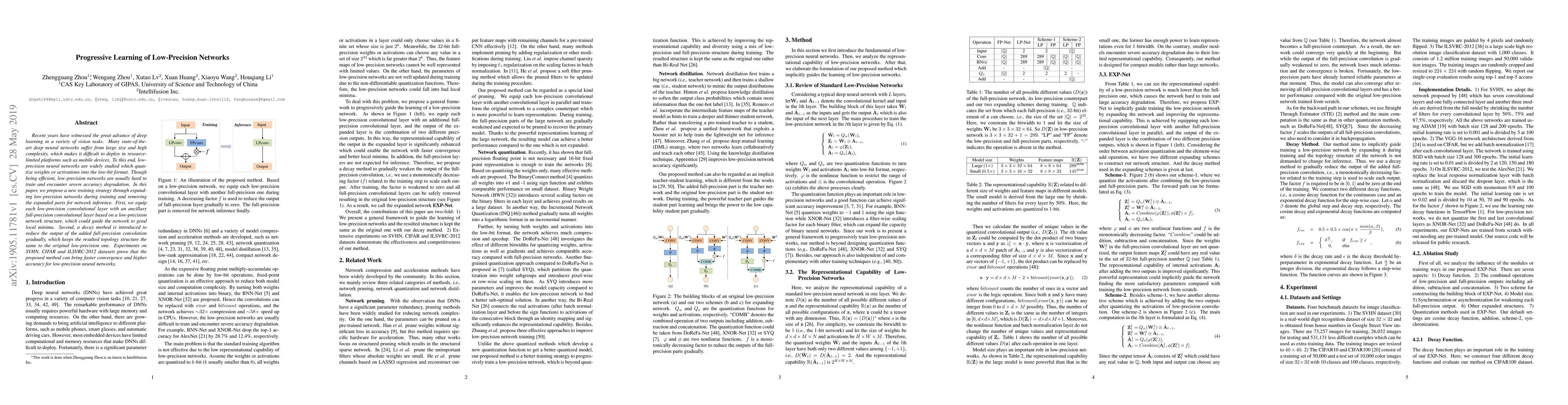 This paper proposes a novel training strategy to improve the efficiency and accuracy of low-precision neural networks by temporarily expanding them during training and then removing the expanded parts for inference. The method includes an ancillary full-precision convolutional layer and a decay method to maintain network topology, leading to faster convergence and higher accuracy on various datasets.