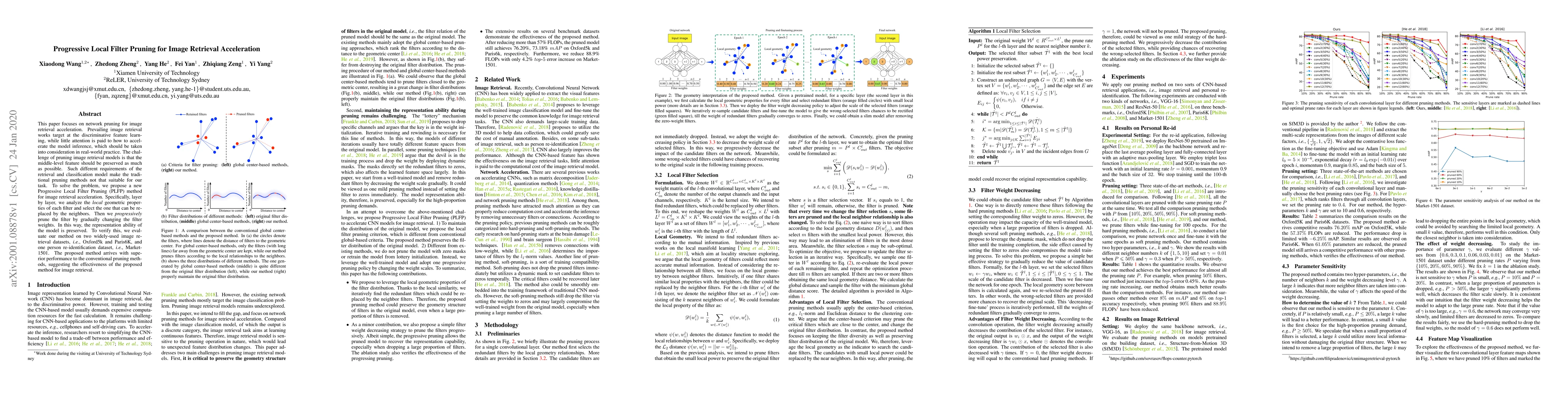 This paper introduces Progressive Local Filter Pruning (PLFP) to accelerate image retrieval by preserving middle-level features, achieving better performance than traditional pruning methods on Oxford5k, Paris6K, and Market-1501 datasets.