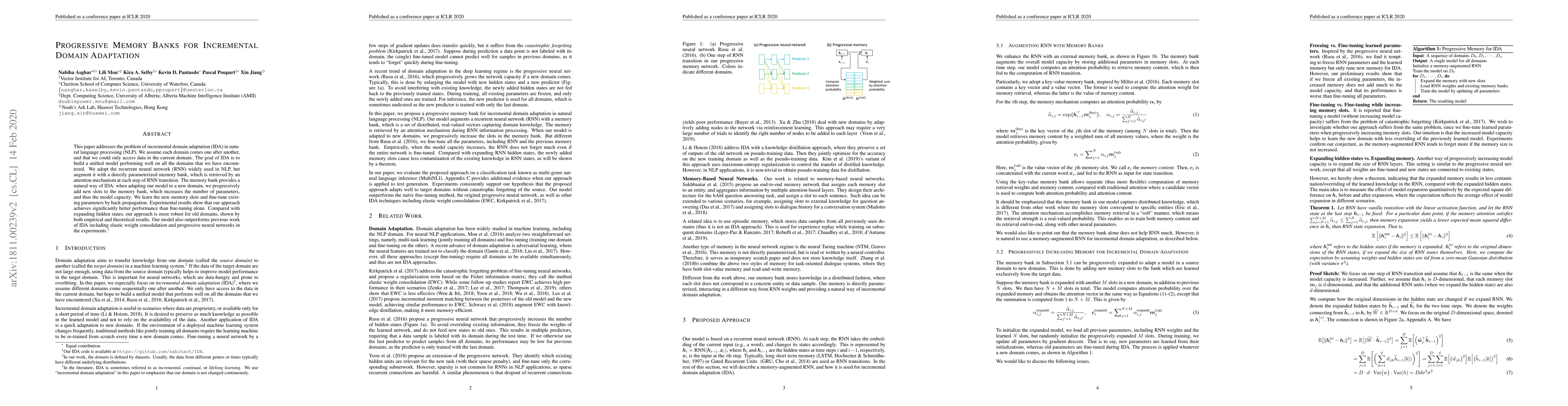 This paper addresses the problem of incremental domain adaptation (IDA) in natural language processing (NLP). We assume each domain comes one after another, and that we could only access data in the current domain. The goal of IDA is to build a unified model performing well on all the domains that we have encountered. We adopt the recurrent neural network (RNN) widely used in NLP, but augment it with a directly parameterized memory bank, which is retrieved by an attention mechanism at each step of RNN transition. The memory bank provides a natural way of IDA: when adapting our model to a new domain, we progressively add new slots to the memory bank, which increases the number of parameters, and thus the model capacity. We learn the new memory slots and fine-tune existing parameters by back-propagation. Experimental results show that our approach achieves significantly better performance than fine-tuning alone. Compared with expanding hidden states, our approach is more robust for old domains, shown by both empirical and theoretical results. Our model also outperforms previous work of IDA including elastic weight consolidation and progressive neural networks in the experiments.