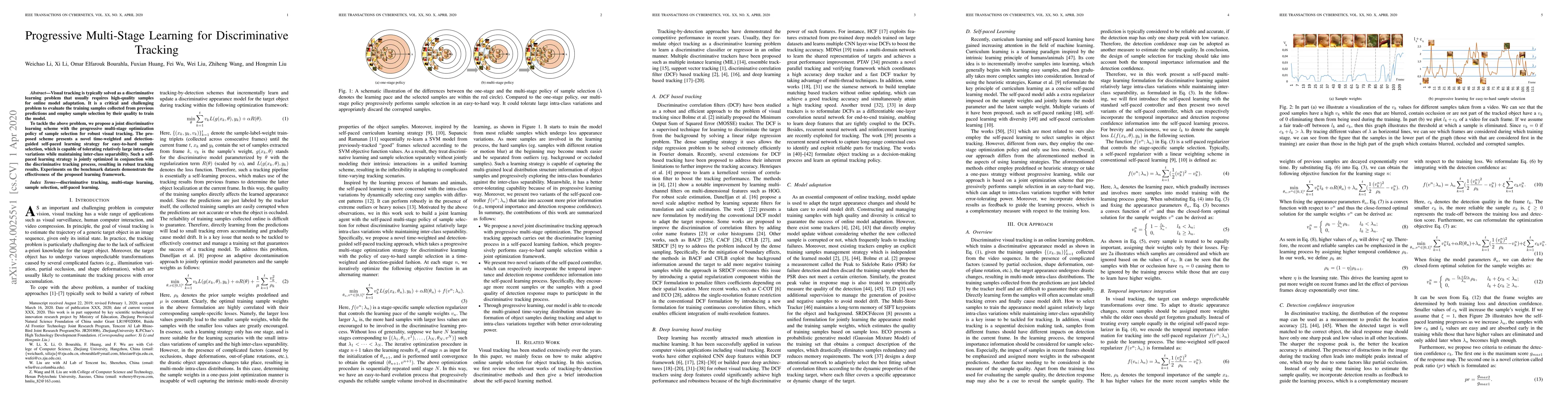 This paper proposes a progressive multi-stage learning scheme for discriminative visual tracking that employs a time-weighted, detection-guided self-paced learning strategy for effective sample selection, balancing easy-to-hard samples to handle intra-class variations while maintaining inter-class separability. Experimental results on benchmark datasets show the robustness and effectiveness of the proposed method.