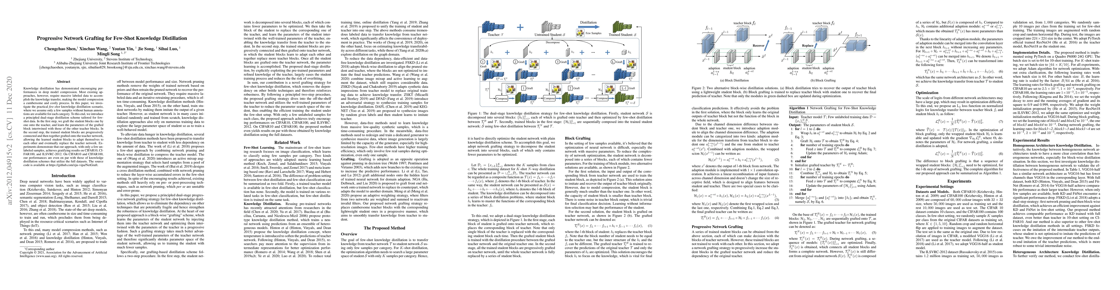 This paper proposes a progressive network grafting method for few-shot knowledge distillation, enabling effective model compression with minimal labeled data. The dual-stage approach sequentially grafts student blocks onto a teacher network, achieving competitive performance on CIFAR10, CIFAR100, and ILSVRC-2012 datasets.