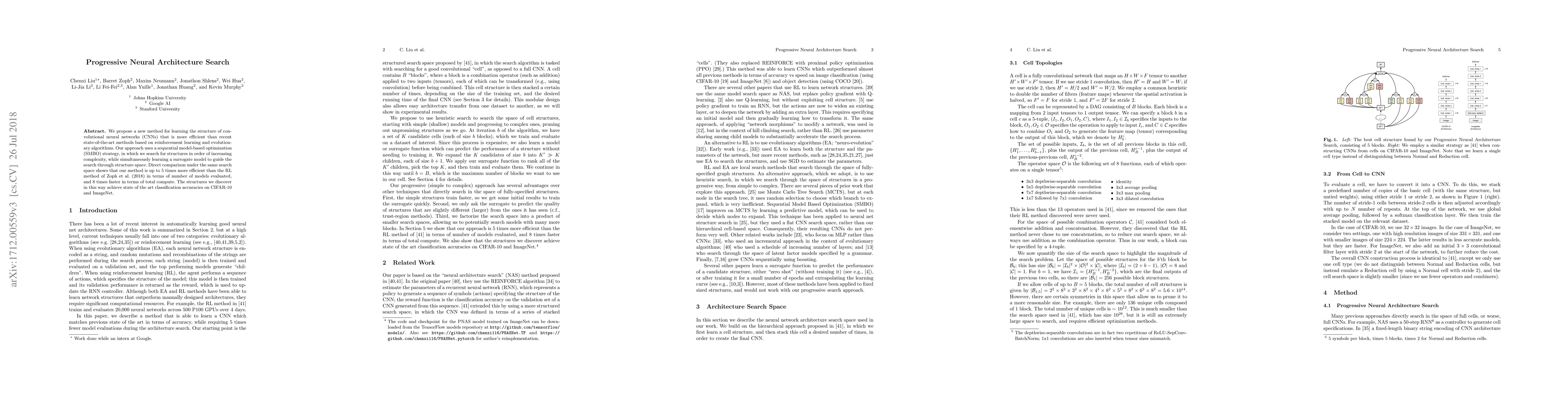 We propose a new method for learning the structure of convolutional neural networks (CNNs) that is more efficient than recent state-of-the-art methods based on reinforcement learning and evolutionary algorithms. Our approach uses a sequential model-based optimization (SMBO) strategy, in which we search for structures in order of increasing complexity, while simultaneously learning a surrogate model to guide the search through structure space. Direct comparison under the same search space shows that our method is up to 5 times more efficient than the RL method of Zoph et al. (2018) in terms of number of models evaluated, and 8 times faster in terms of total compute. The structures we discover in this way achieve state of the art classification accuracies on CIFAR-10 and ImageNet.