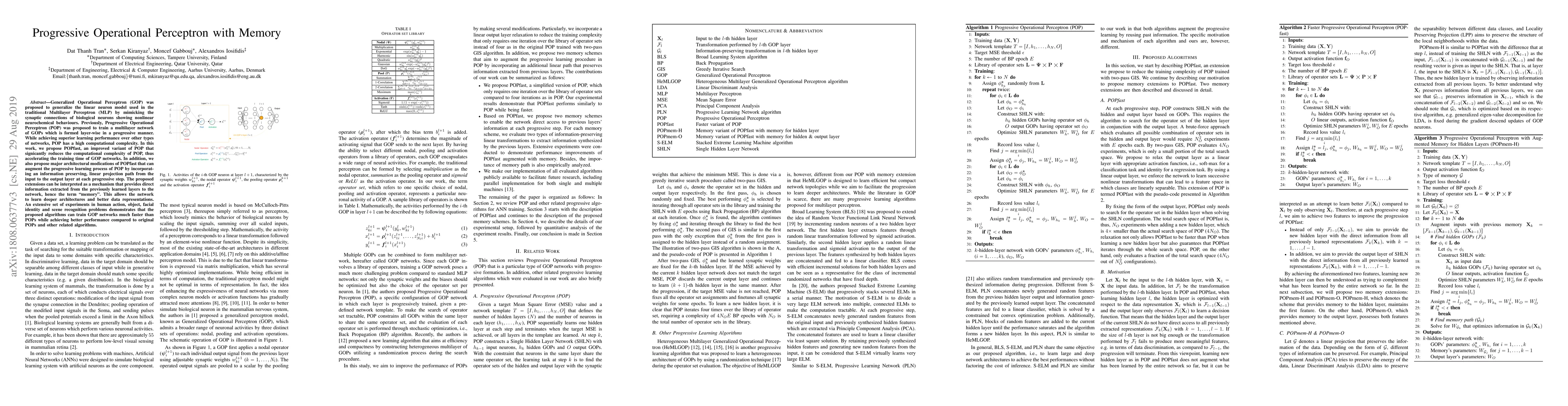 The paper proposes modifications to the Progressive Operational Perceptron (POP) by incorporating a memory mechanism through linear projections, enhancing its learning capability and enabling it to build deeper architectures with improved data representations. Experimental results demonstrate superior performance compared to the original POP and other related algorithms.