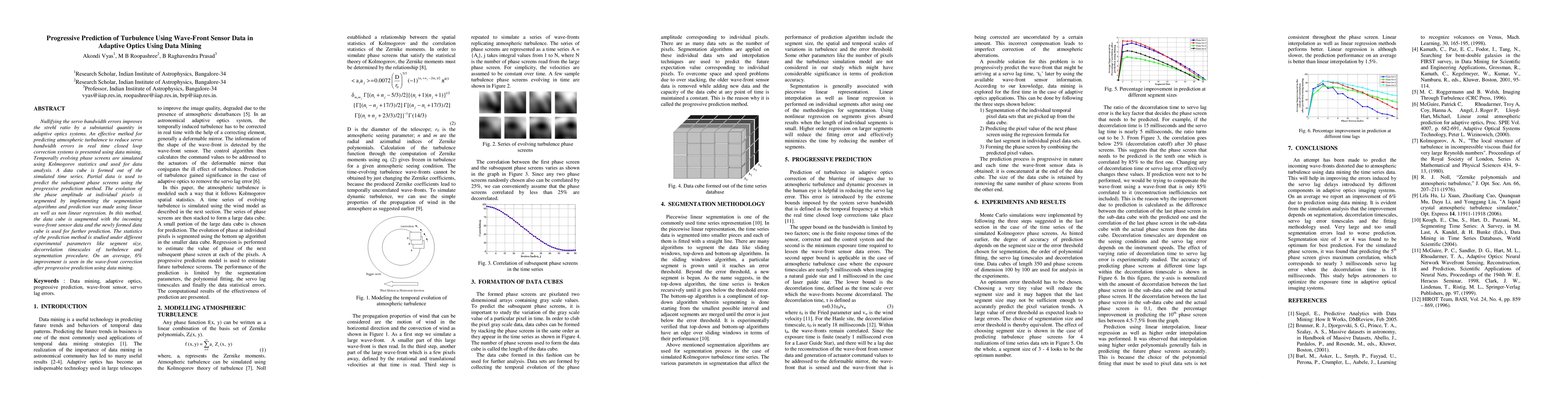 This paper presents a data mining approach to predict atmospheric turbulence in adaptive optics systems, aiming to improve the strehl ratio by reducing servo bandwidth errors. Using simulated temporally evolving phase screens and segmentation algorithms, the method predicts future phase screens and shows an average 6% improvement in wave-front correction.