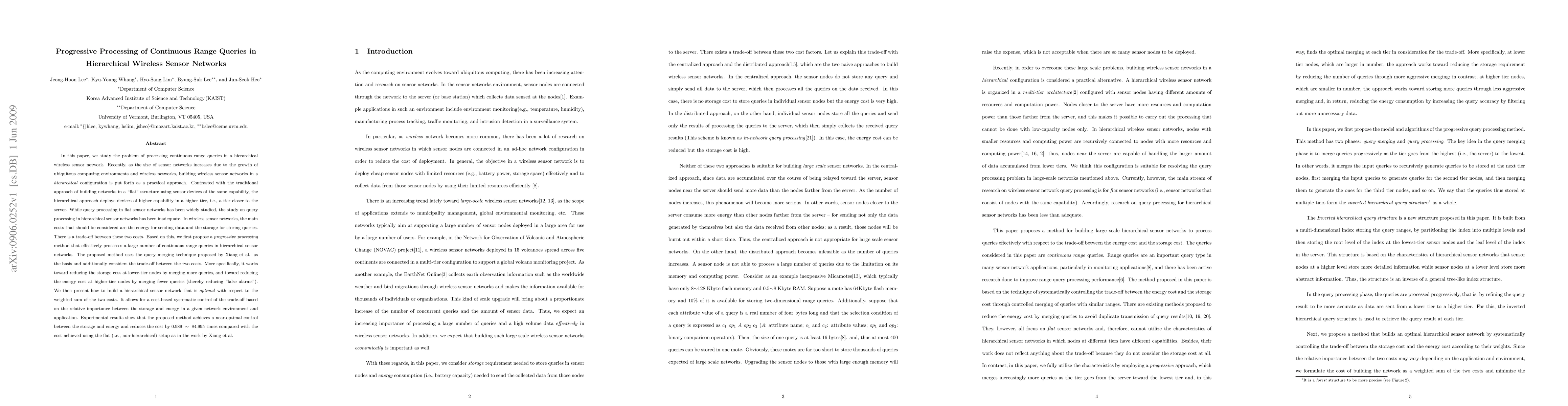 This paper proposes a progressive processing method for continuous range queries in hierarchical wireless sensor networks, optimizing the trade-off between energy and storage costs. The method merges queries to reduce costs at different tiers, achieving near-optimal control and significant cost reductions compared to flat network setups.