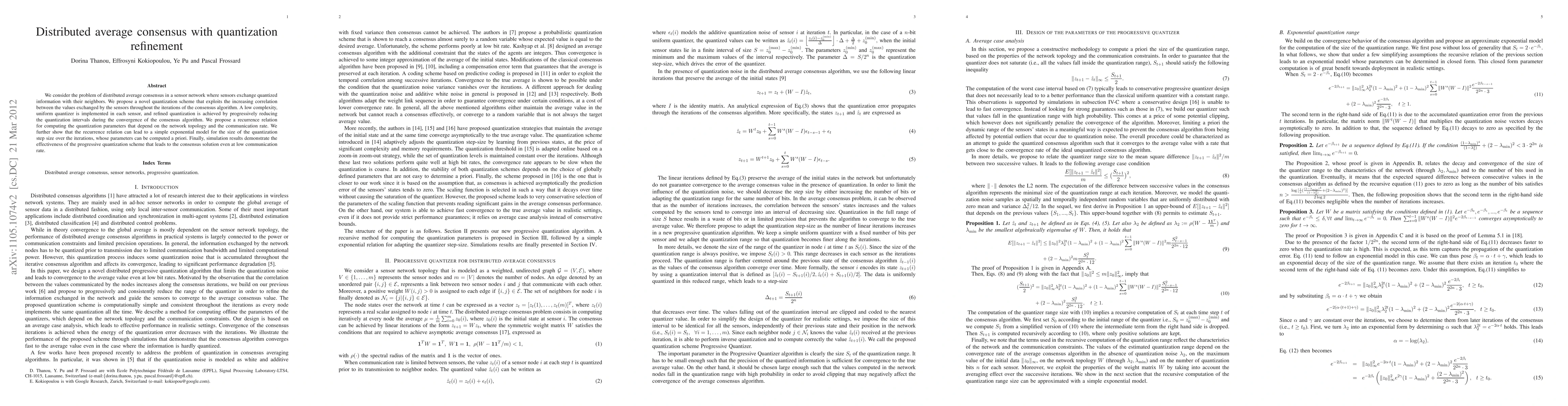 This paper proposes a novel quantization scheme for distributed average consensus in sensor networks, utilizing a progressive reduction in quantization intervals to exploit increasing correlation among exchanged values. The method employs a low complexity uniform quantizer and a recurrence relation for quantization parameters, leading to an exponential model for quantization step size and demonstrating effective consensus convergence at low communication rates.