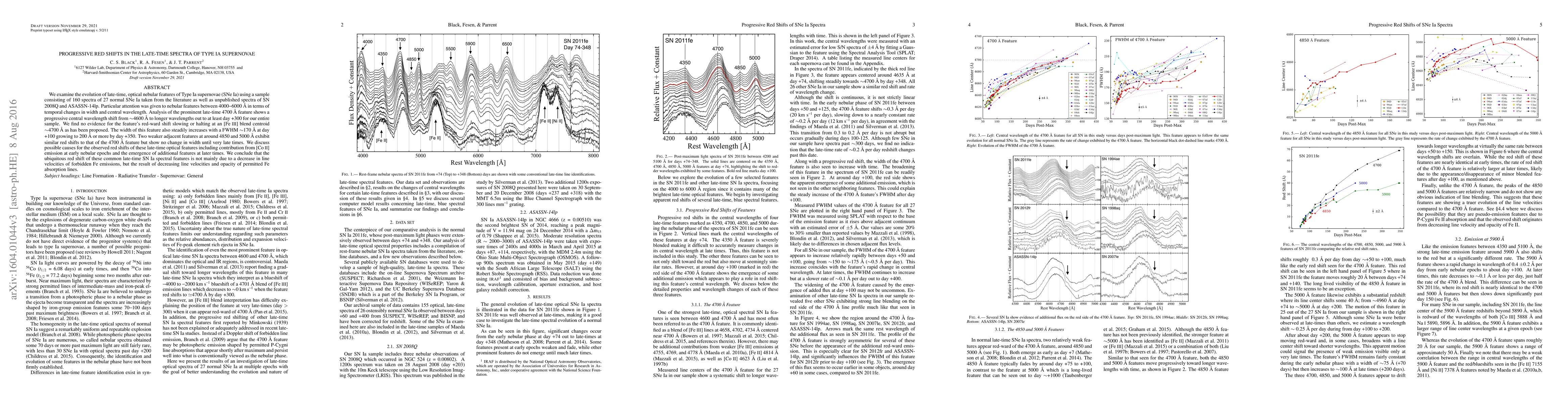 Type Ia supernovae exhibit progressive red shifts in late-time optical nebular features, with a central wavelength shift of up to 300 days, and increasing widths, contradicting earlier theories about forbidden Fe lines.