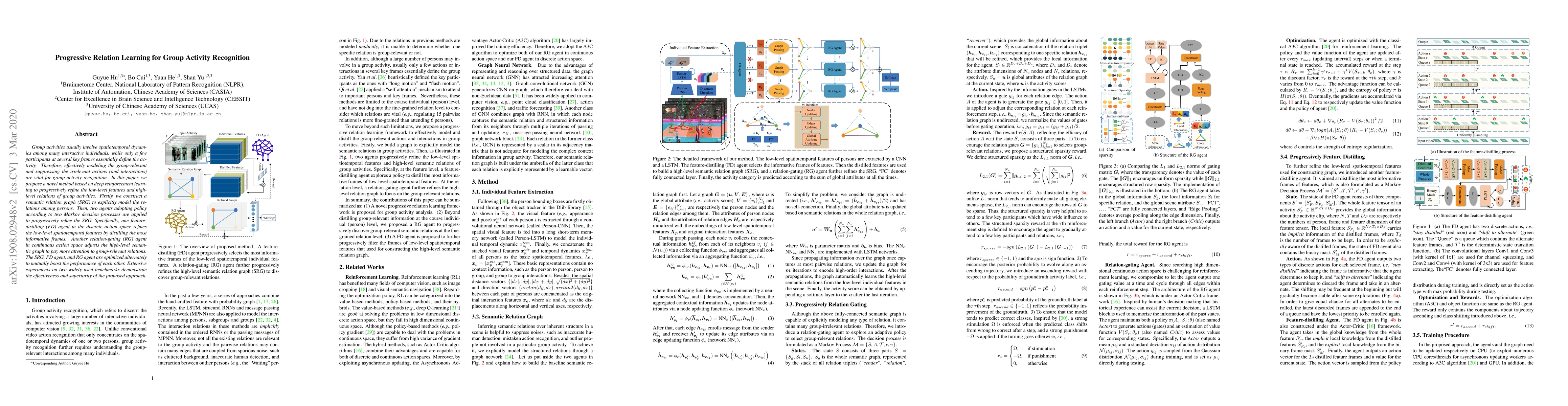 This paper proposes a deep reinforcement learning method for group activity recognition, utilizing a semantic relation graph to model person interactions. It employs two agents to progressively refine low-level features and high-level relations, showing improved performance on benchmarks.