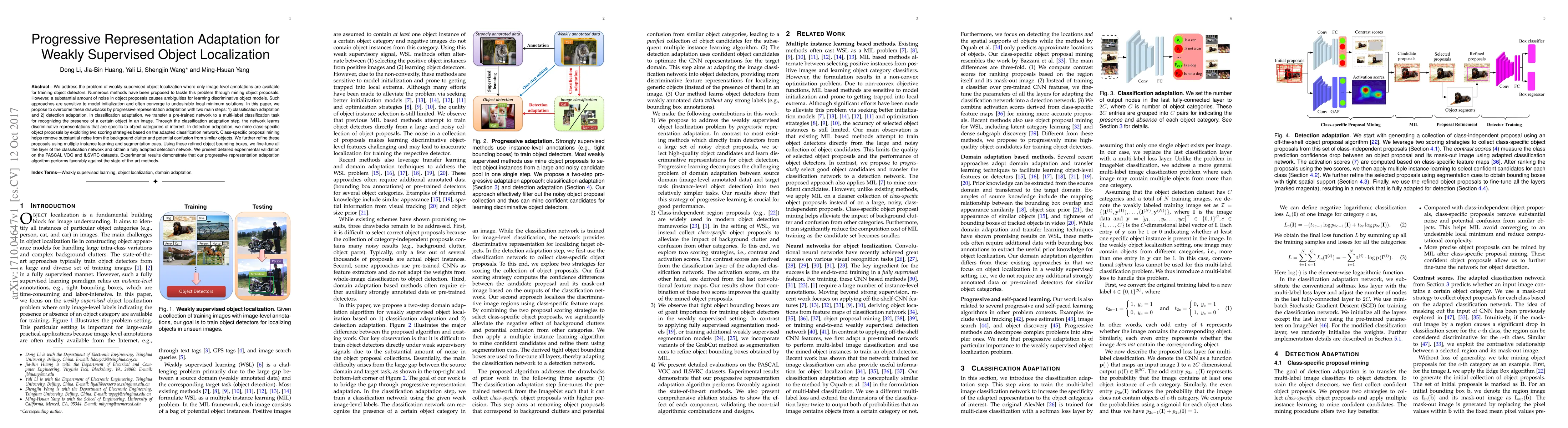 This paper proposes a method for weakly supervised object localization using progressive representation adaptation, consisting of classification adaptation and detection adaptation. It effectively reduces noise in object proposals and outperforms state-of-the-art methods on PASCAL VOC and ILSVRC datasets.