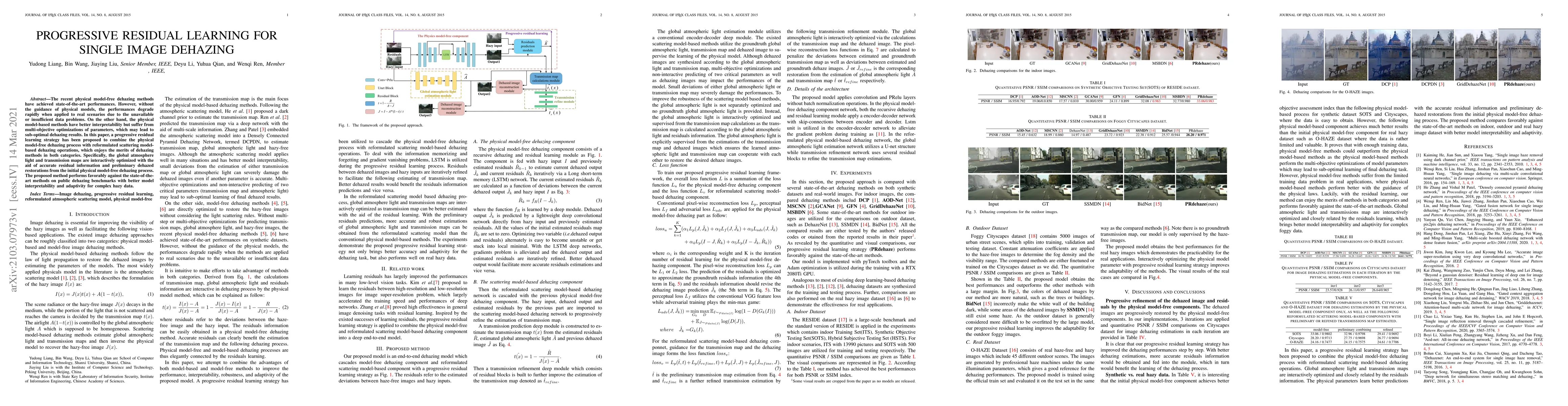 This paper proposes a progressive residual learning strategy that combines physical model-free and model-based dehazing methods to achieve better interpretability and adaptivity for complex hazy data. The method optimizes global atmosphere light and transmission maps using residual information and preliminary dehazed results, outperforming state-of-the-art methods on public benchmarks.
