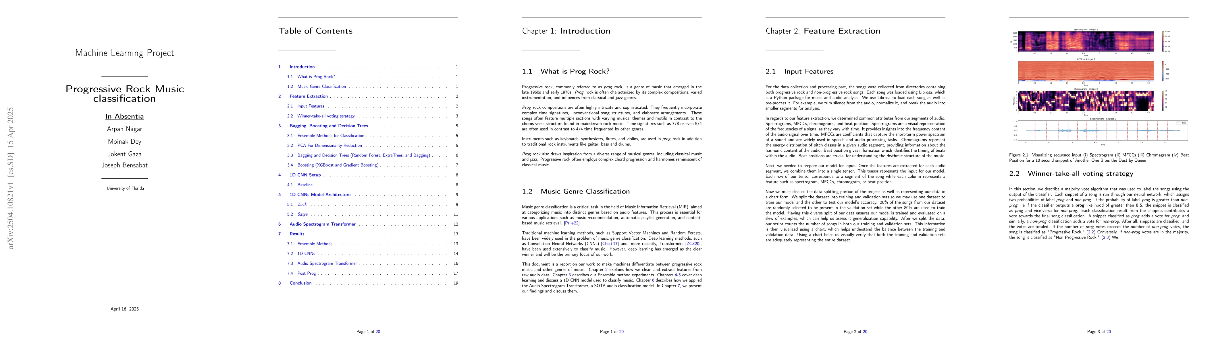 This study investigates progressive rock music classification by extracting comprehensive audio features (spectrograms, MFCCs, chromagrams, beat positions) using the Librosa library. It employs a winner-take-all voting strategy for song classification, comparing various machine learning techniques such as ensemble methods (Random Forest, ExtraTrees, Bagging Classifier, XGBoost, Gradient Boosting) and deep learning approaches (custom 1D CNN architectures 'Zuck' and 'Satya', fine-tuned Audio Spectrogram Transformer (AST) model).
