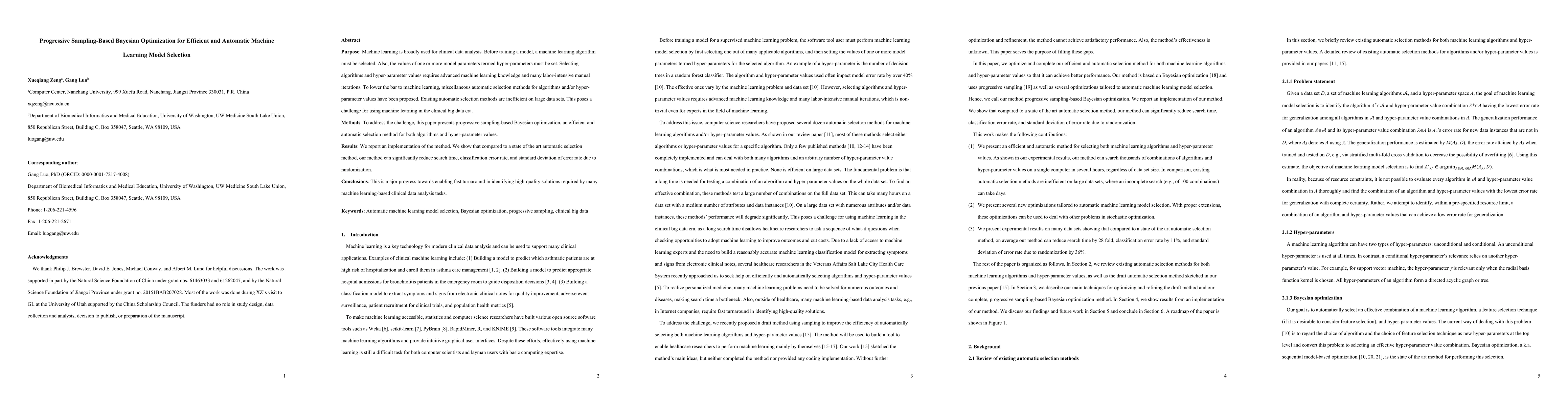 This paper introduces progressive sampling-based Bayesian optimization for automatic machine learning model selection, significantly reducing search time and error rates compared to existing methods, thus facilitating efficient clinical data analysis.