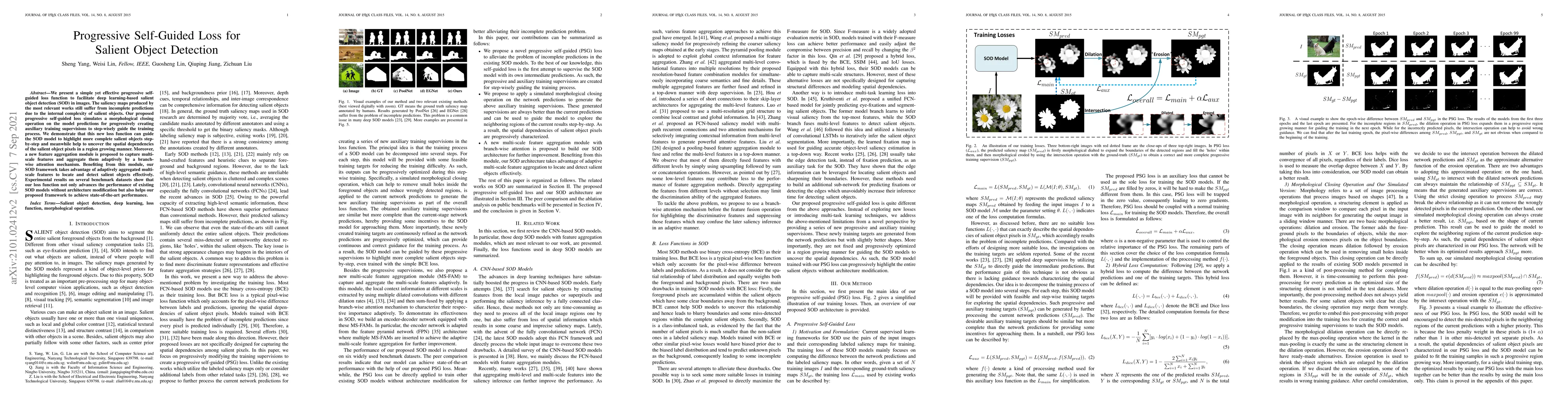 This paper introduces a progressive self-guided loss function to enhance salient object detection by simulating morphological closing operations to create auxiliary training supervisions. It also proposes a feature aggregation module with branch-wise attention to capture multi-scale features, achieving state-of-the-art performance on benchmark datasets.
