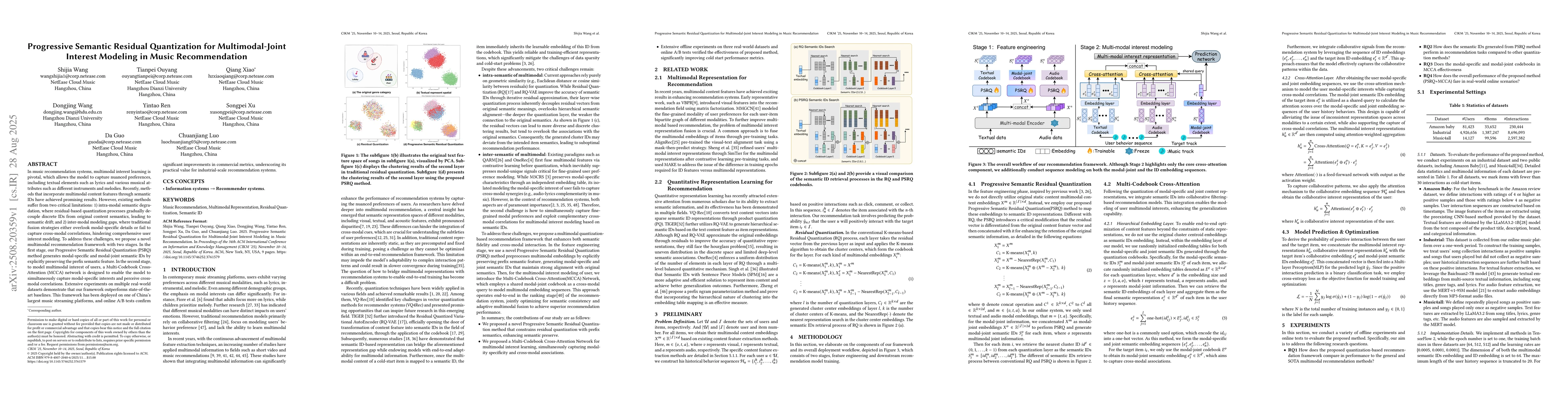 In music recommendation systems, multimodal interest learning is pivotal, which allows the model to capture nuanced preferences, including textual elements such as lyrics and various musical attributes such as different instruments and melodies. Recently, methods that incorporate multimodal content features through semantic IDs have achieved promising results. However, existing methods suffer from two critical limitations: 1) intra-modal semantic degradation, where residual-based quantization processes gradually decouple discrete IDs from original content semantics, leading to semantic drift; and 2) inter-modal modeling gaps, where traditional fusion strategies either overlook modal-specific details or fail to capture cross-modal correlations, hindering comprehensive user interest modeling. To address these challenges, we propose a novel multimodal recommendation framework with two stages. In the first stage, our Progressive Semantic Residual Quantization (PSRQ) method generates modal-specific and modal-joint semantic IDs by explicitly preserving the prefix semantic feature. In the second stage, to model multimodal interest of users, a Multi-Codebook Cross-Attention (MCCA) network is designed to enable the model to simultaneously capture modal-specific interests and perceive cross-modal correlations. Extensive experiments on multiple real-world datasets demonstrate that our framework outperforms state-of-the-art baselines. This framework has been deployed on one of China's largest music streaming platforms, and online A/B tests confirm significant improvements in commercial metrics, underscoring its practical value for industrial-scale recommendation systems.