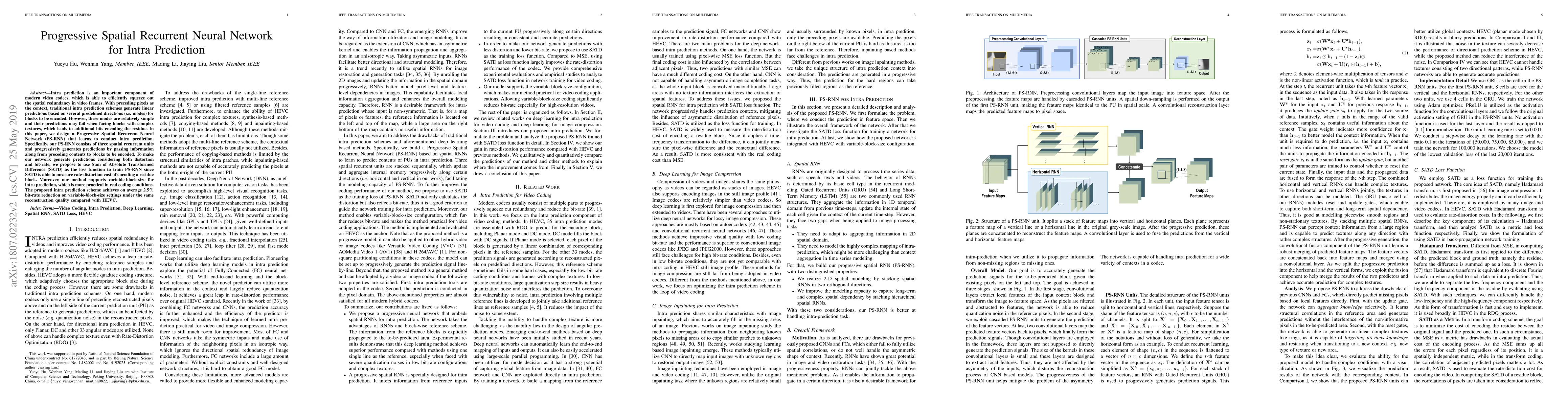 This paper proposes a Progressive Spatial Recurrent Neural Network (PS-RNN) for intra prediction in video codecs to improve spatial redundancy removal. The PS-RNN employs spatial recurrent units to progressively generate predictions based on context, achieving a 2.5% bit-rate reduction compared to HEVC while maintaining reconstruction quality.