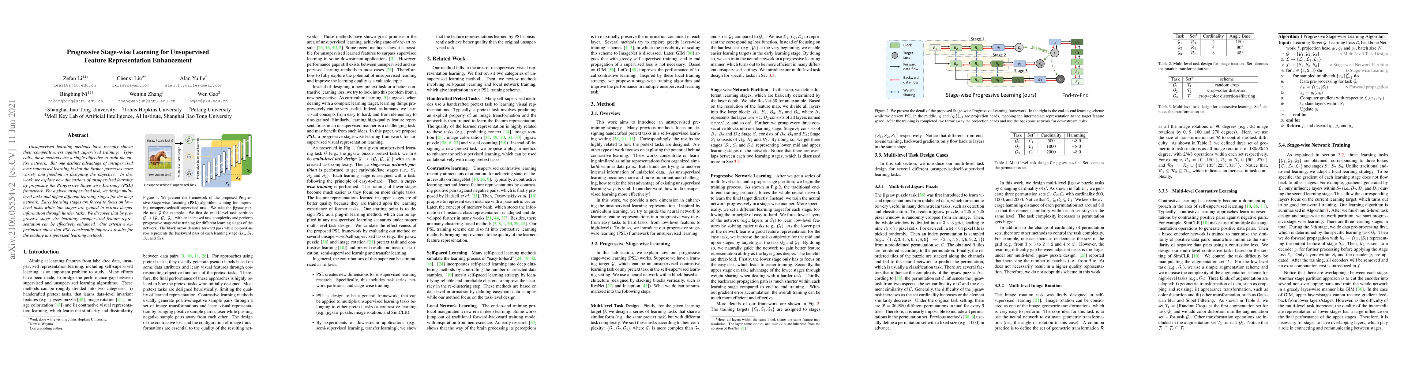 This paper proposes the Progressive Stage-wise Learning (PSL) framework to enhance unsupervised feature representation. By designing multilevel tasks and different learning stages, PSL forces early stages to focus on low-level tasks while guiding later stages to extract deeper information, consistently improving results for leading unsupervised learning methods.