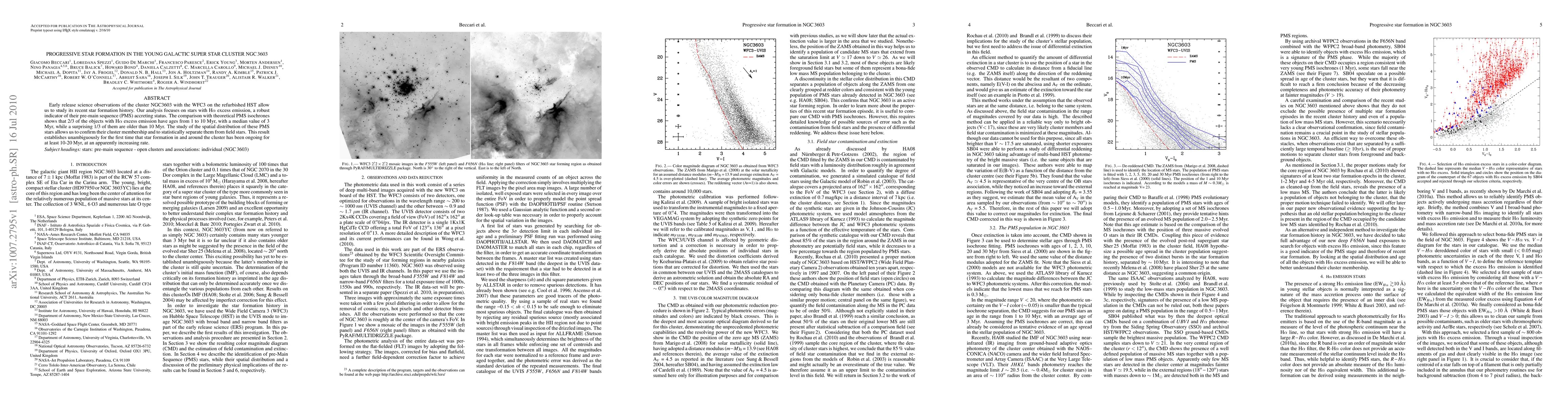 Early release science observations of the cluster NGC3603 with the WFC3 on the refurbished HST allow us to study its recent star formation history. Our analysis focuses on stars with Halpha excess emission, a robust indicator of their pre-main sequence (PMS) accreting status. The comparison with theoretical PMS isochrones shows that 2/3 of the objects with Halpha excess emission have ages from 1 to 10 Myr, with a median value of 3 Myr, while a surprising 1/3 of them are older than 10 Myr. The study of the spatial distribution of these PMS stars allows us to confirm their cluster membership and to statistically separate them from field stars. This result establishes unambiguously for the first time that star formation in and around the cluster has been ongoing for at least 10-20 Myr, at an apparently increasing rate.