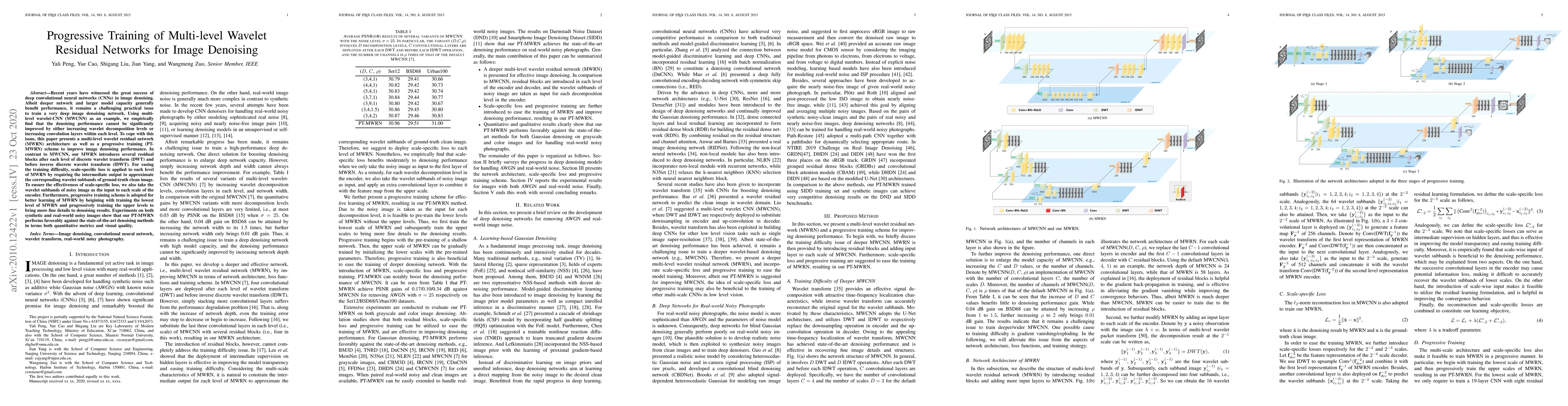 This paper proposes a multi-level wavelet residual network (MWRN) with a progressive training scheme to enhance image denoising performance. The MWRN incorporates residual blocks to improve training efficiency and uses scale-specific loss to better approximate wavelet subbands of the clean image, achieving superior results compared to state-of-the-art methods.