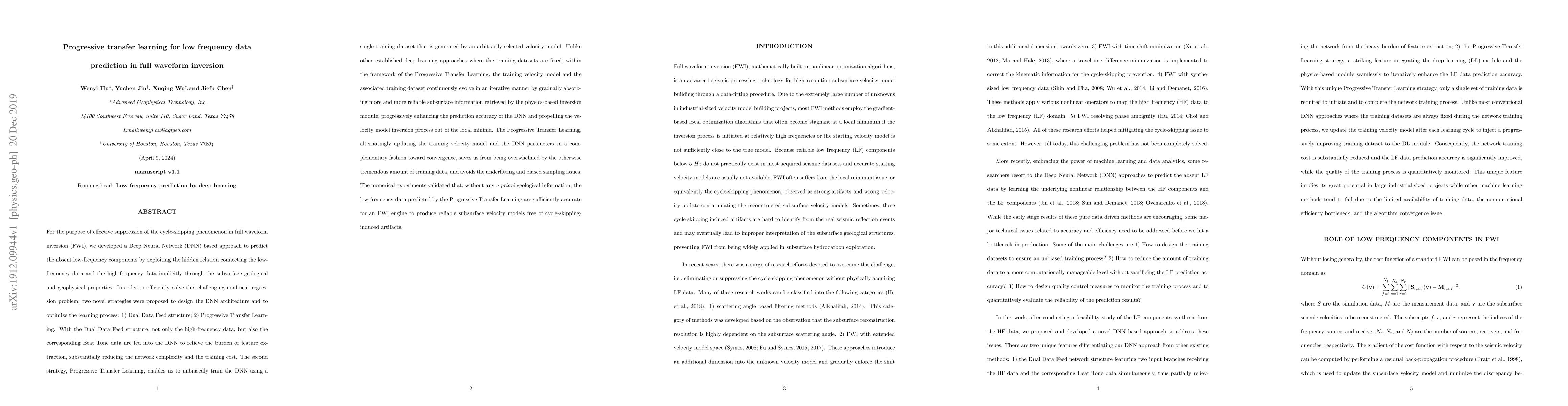This paper proposes a Deep Neural Network (DNN) approach to predict low-frequency components in full waveform inversion (FWI) using Progressive Transfer Learning and Dual Data Feed to suppress cycle-skipping. The method iteratively updates the training dataset and network parameters, enhancing prediction accuracy and avoiding underfitting.