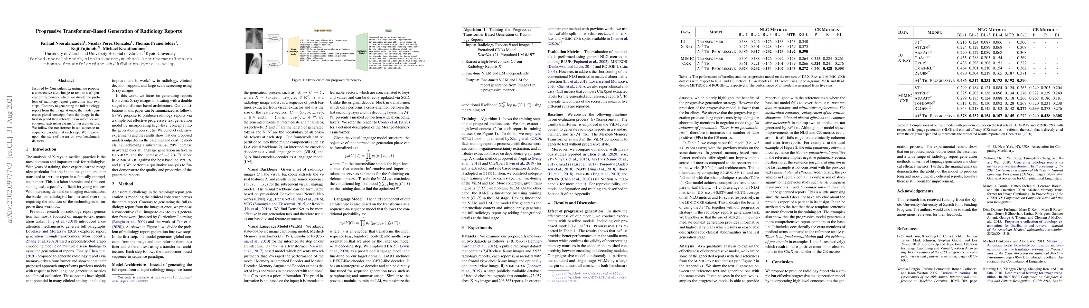 This paper proposes a two-step progressive transformer-based framework for generating radiology reports, first extracting global concepts from images and then refining them into coherent texts, outperforming state-of-the-art methods on benchmark datasets.