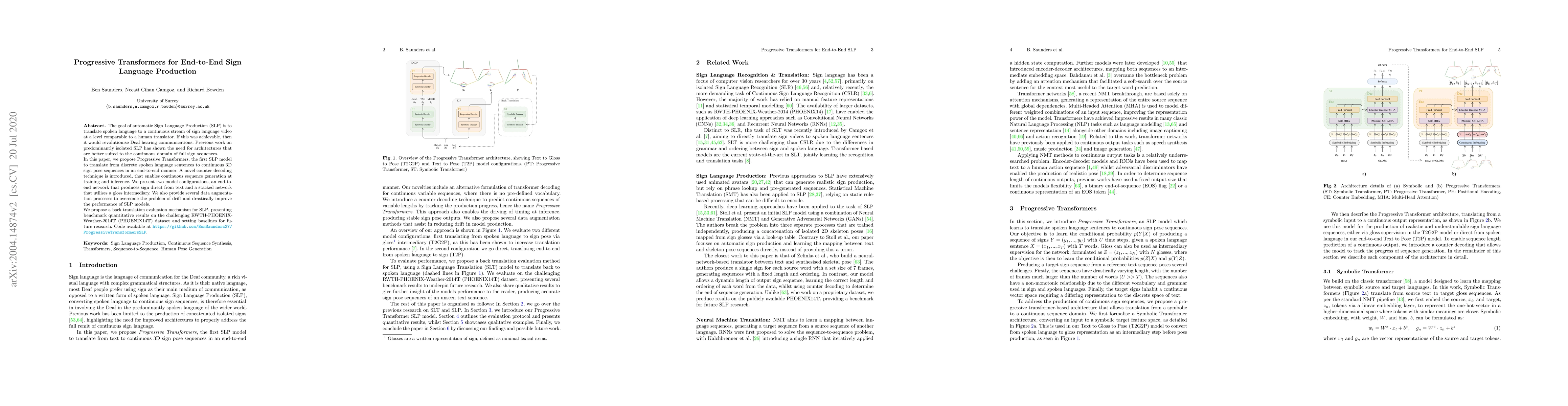 This paper introduces Progressive Transformers, a novel architecture for translating spoken language into continuous sign language video, aiming to achieve human-like translation. The proposed model includes an end-to-end network and a stacked network with a gloss intermediary, employing a counter for continuous sequence generation and data augmentation techniques to improve performance.