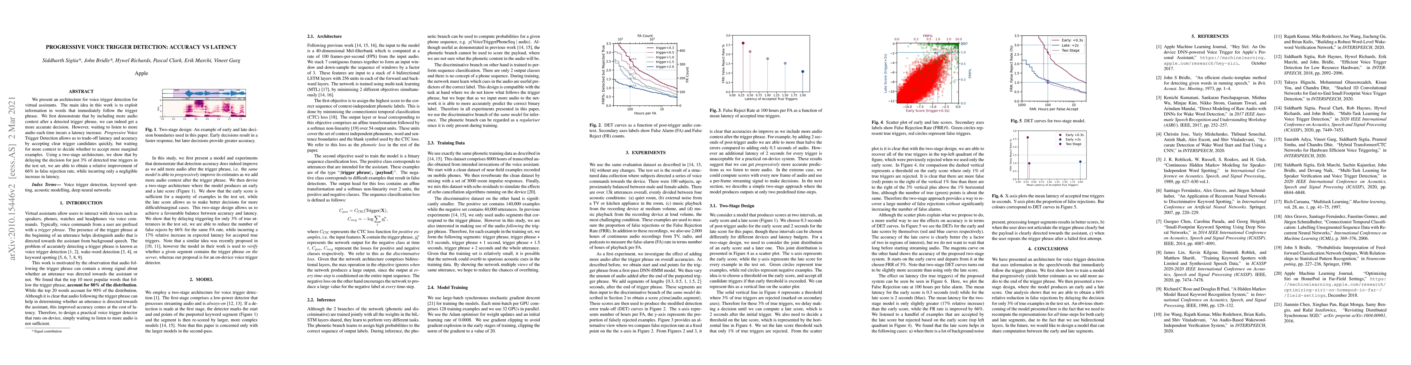 This paper proposes a two-stage architecture for progressive voice trigger detection in virtual assistants, balancing accuracy and latency. By utilizing additional audio context after a trigger phrase, the system achieves higher accuracy but with increased latency, demonstrating a 66% improvement in false rejection rate by delaying decisions for marginal examples, with minimal latency increase.