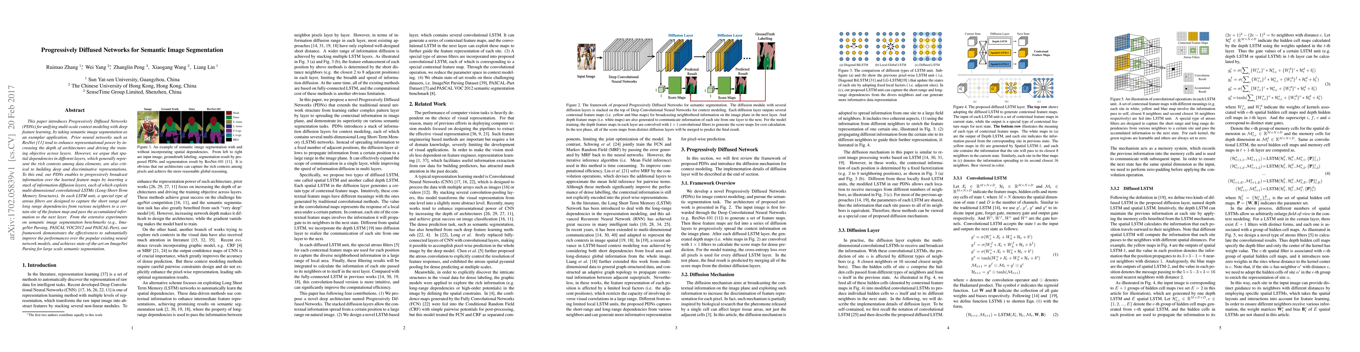 This paper introduces Progressively Diffused Networks (PDNs) for unifying multi-scale context modeling with deep feature learning, by taking semantic image segmentation as an exemplar application. Prior neural networks, such as ResNet, tend to enhance representational power by increasing the depth of architectures and driving the training objective across layers. However, we argue that spatial dependencies in different layers, which generally represent the rich contexts among data elements, are also critical to building deep and discriminative representations. To this end, our PDNs enables to progressively broadcast information over the learned feature maps by inserting a stack of information diffusion layers, each of which exploits multi-dimensional convolutional LSTMs (Long-Short-Term Memory Structures). In each LSTM unit, a special type of atrous filters are designed to capture the short range and long range dependencies from various neighbors to a certain site of the feature map and pass the accumulated information to the next layer. From the extensive experiments on semantic image segmentation benchmarks (e.g., ImageNet Parsing, PASCAL VOC2012 and PASCAL-Part), our framework demonstrates the effectiveness to substantially improve the performances over the popular existing neural network models, and achieves state-of-the-art on ImageNet Parsing for large scale semantic segmentation.