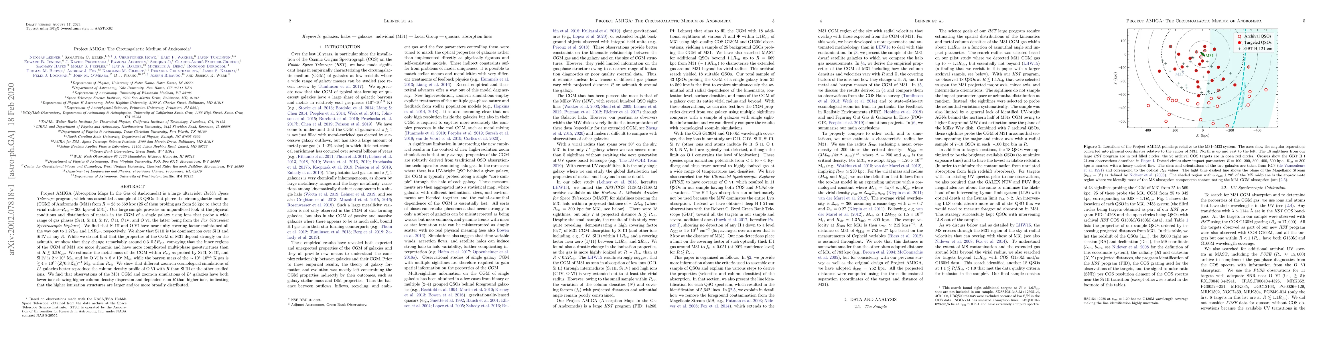 Project AMIGA (Absorption Maps In the Gas of Andromeda) is a large ultraviolet Hubble Space Telescope program, which has assembled a sample of 43 QSOs that pierce the circumgalactic medium (CGM) of Andromeda (M31) from R=25 to 569 kpc (25 of them probing gas from 25 kpc to about the virial radius-Rvir = 300 kpc-of M31). Our large sample provides an unparalleled look at the physical conditions and distribution of metals in the CGM of a single galaxy using ions that probe a wide range of gas phases (Si II, Si III, Si IV, C II, C IV, and O VI, the latter being from the Far Ultraviolet Spectroscopic Explorer). We find that Si III and O VI have near unity covering factor maintained all the way out to 1.2Rvir and 1.9Rvir, respectively. We show that Si III is the dominant ion over Si II and Si IV at any R. While we do not find that the properties of the CGM of M31 depend strongly on the azimuth, we show that they change remarkably around 0.3-0.5Rvir, conveying that the inner regions of the CGM of M31 are more dynamic and have more complicated multi-phase gas-structures than at R>0.5Rvir. We estimate the metal mass of the CGM within Rvir as probed by Si II, Si III, and Si IV is 2x10^7 Msun and by O VI is >8x10^7 Msun, while the baryon mass of the 10^4-10^5.5 K gas is ~4x10^10 (Z/0.3 Zsun)^(-1) Msun within Rvir. We show that different zoom-in cosmological simulations of L* galaxies better reproduce the column density profile of O VI with R than Si III or the other studied ions. We find that observations of the M31 CGM and zoom-in simulations of L* galaxies have both lower ions showing higher column density dispersion and dependence on R than higher ions, indicating that the higher ionization structures are larger and/or more broadly distributed.