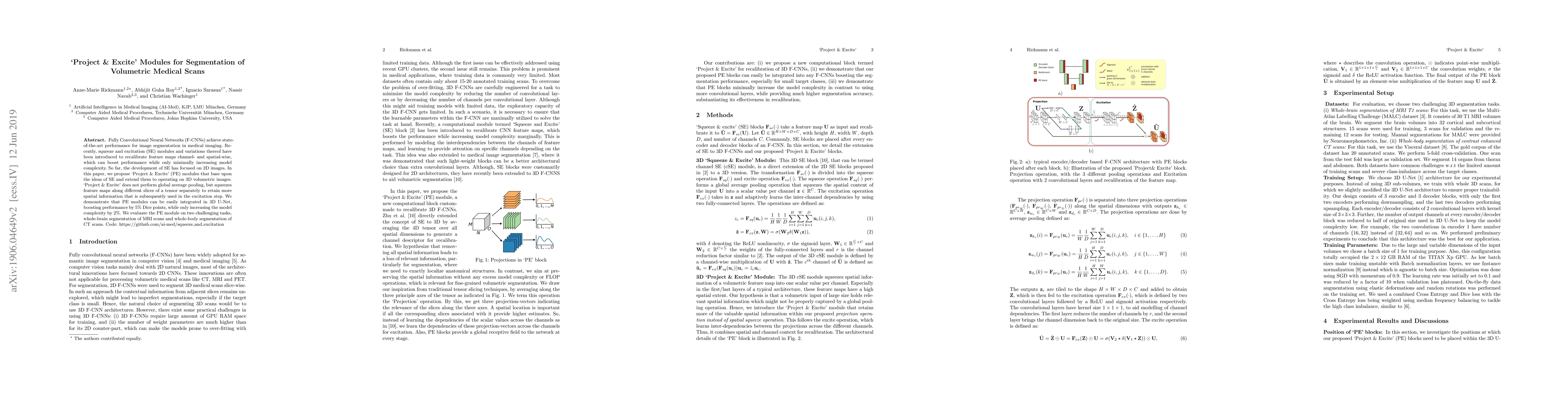 Fully Convolutional Neural Networks (F-CNNs) achieve state-of-the-art performance for image segmentation in medical imaging. Recently, squeeze and excitation (SE) modules and variations thereof have been introduced to recalibrate feature maps channel- and spatial-wise, which can boost performance while only minimally increasing model complexity. So far, the development of SE has focused on 2D images. In this paper, we propose `Project & Excite' (PE) modules that base upon the ideas of SE and extend them to operating on 3D volumetric images. `Project & Excite' does not perform global average pooling, but squeezes feature maps along different slices of a tensor separately to retain more spatial information that is subsequently used in the excitation step. We demonstrate that PE modules can be easily integrated in 3D U-Net, boosting performance by 5% Dice points, while only increasing the model complexity by 2%. We evaluate the PE module on two challenging tasks, whole-brain segmentation of MRI scans and whole-body segmentation of CT scans. Code: https://github.com/ai-med/squeeze_and_excitation