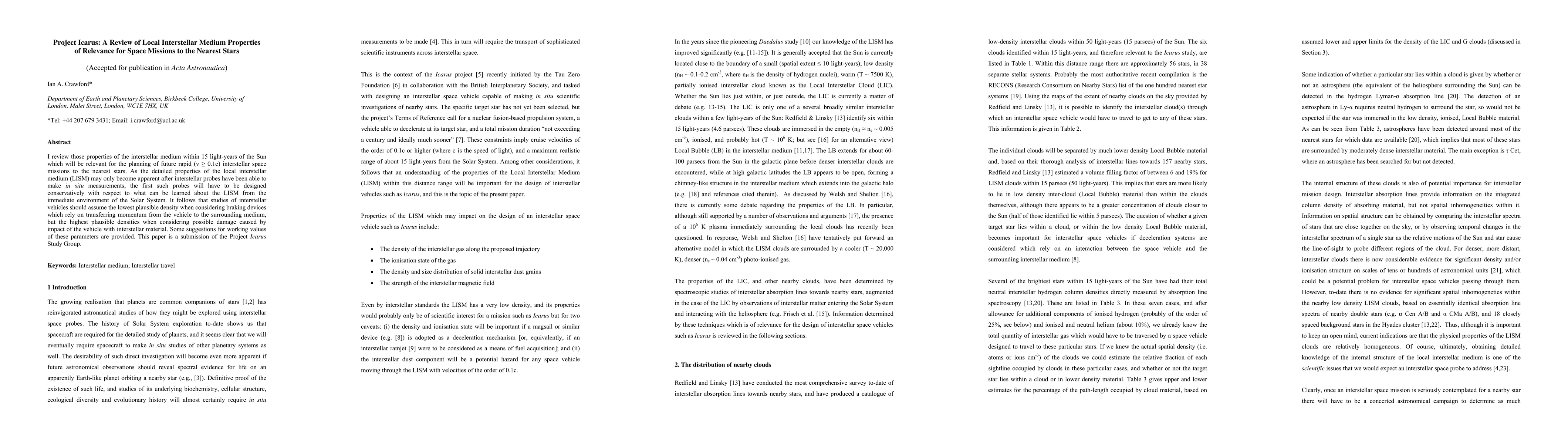 I review those properties of the interstellar medium within 15 light-years of the Sun which will be relevant for the planning of future rapid ($v /ge 0.1c$) interstellar space missions to the nearest stars. As the detailed properties of the local interstellar medium (LISM) may only become apparent after interstellar probes have been able to make in situ measurements, the first such probes will have to be designed conservatively with respect to what can be learned about the LISM from the immediate environment of the Solar System. It follows that studies of interstellar vehicles should assume the lowest plausible density when considering braking devices which rely on transferring momentum from the vehicle to the surrounding medium, but the highest plausible densities when considering possible damage caused by impact of the vehicle with interstellar material. Some suggestions for working values of these parameters are provided. This paper is a submission of the Project Icarus Study Group.