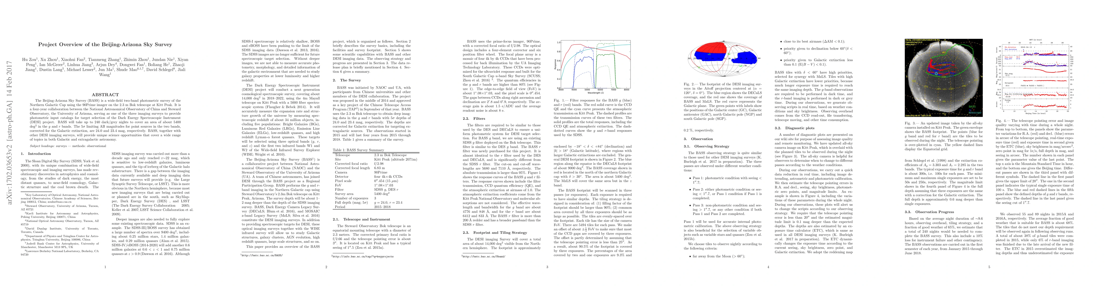 The Beijing-Arizona Sky Survey (BASS) is a two-band photometric survey of the Northern Galactic Cap, conducted over four years using the 90Prime imager on the Bok telescope. It aims to provide photometric data for the Dark Energy Spectroscopic Instrument (DESI) project, covering 5400 deg$^2$ with 5$\sigma$ limiting magnitudes of 24.0 and 23.4 mag in the $g$ and $r$ bands, respectively.