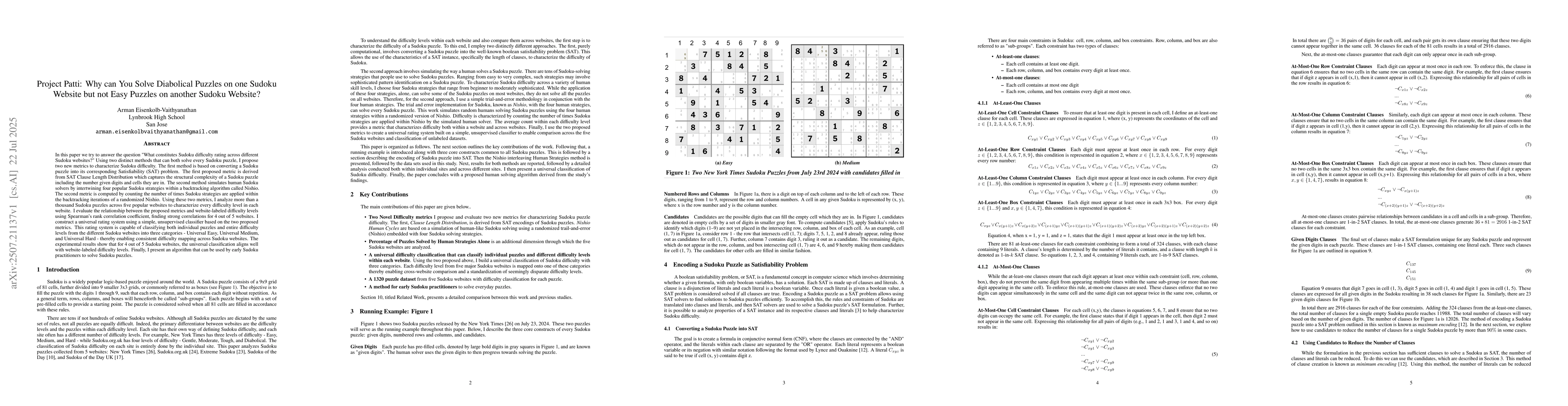 In this paper we try to answer the question "What constitutes Sudoku difficulty rating across different Sudoku websites?" Using two distinct methods that can both solve every Sudoku puzzle, I propose two new metrics to characterize Sudoku difficulty. The first method is based on converting a Sudoku puzzle into its corresponding Satisfiability (SAT) problem. The first proposed metric is derived from SAT Clause Length Distribution which captures the structural complexity of a Sudoku puzzle including the number of given digits and the cells they are in. The second method simulates human Sudoku solvers by intertwining four popular Sudoku strategies within a backtracking algorithm called Nishio. The second metric is computed by counting the number of times Sudoku strategies are applied within the backtracking iterations of a randomized Nishio. Using these two metrics, I analyze more than a thousand Sudoku puzzles across five popular websites to characterize every difficulty level in each website. I evaluate the relationship between the proposed metrics and website-labeled difficulty levels using Spearman's rank correlation coefficient, finding strong correlations for 4 out of 5 websites. I construct a universal rating system using a simple, unsupervised classifier based on the two proposed metrics. This rating system is capable of classifying both individual puzzles and entire difficulty levels from the different Sudoku websites into three categories - Universal Easy, Universal Medium, and Universal Hard - thereby enabling consistent difficulty mapping across Sudoku websites. The experimental results show that for 4 out of 5 Sudoku websites, the universal classification aligns well with website-labeled difficulty levels. Finally, I present an algorithm that can be used by early Sudoku practitioners to solve Sudoku puzzles.