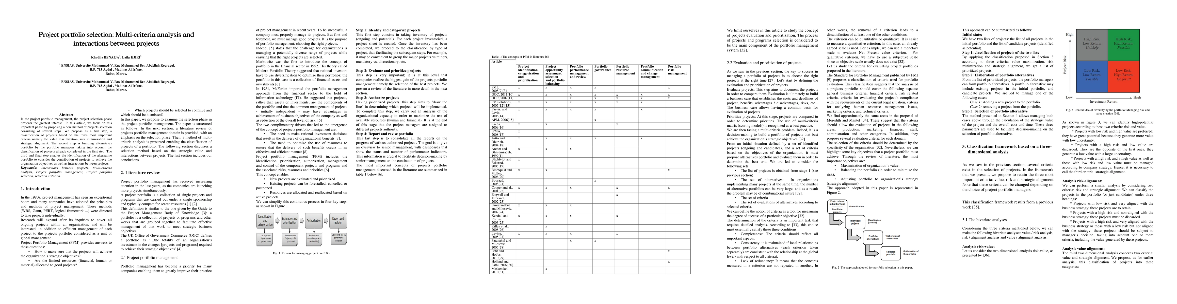 This paper proposes a multi-criteria analysis method for selecting projects in portfolio management, considering value maximization, risk minimization, and strategic alignment. It suggests three steps to build an alternative portfolio that aligns with organizational objectives and project interactions.