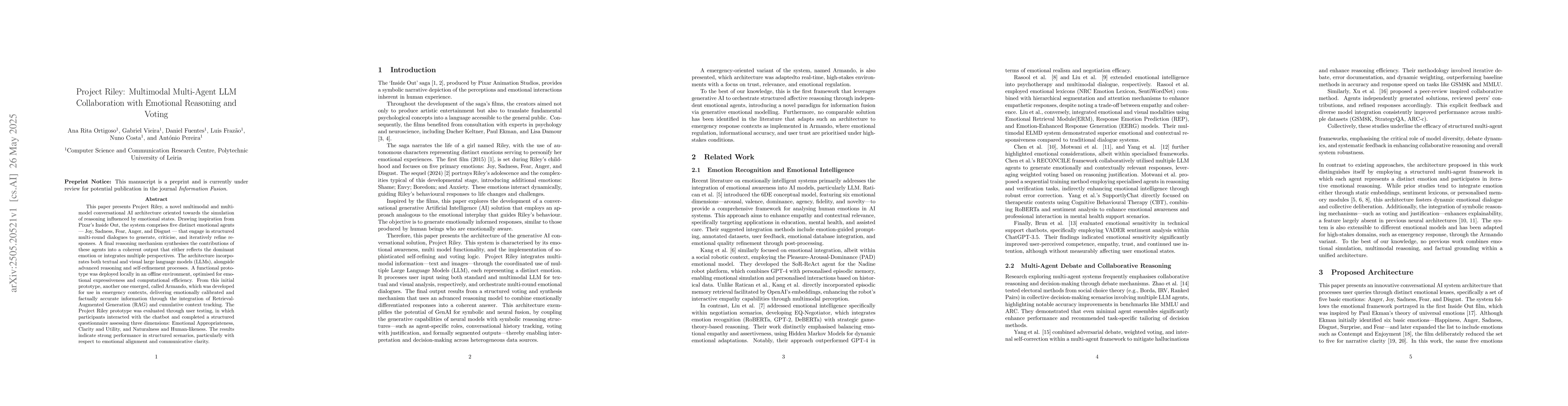 Project Riley introduces a multimodal AI architecture with emotional agents simulating human emotions for conversational responses. It demonstrates strong performance in emotional alignment and communicative clarity in user testing, with a prototype, Armando, developed for emergency contexts.