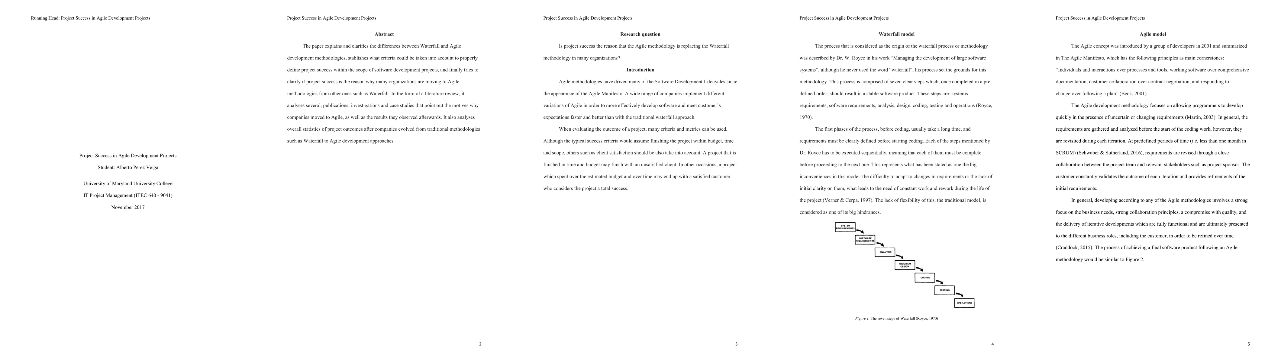 This paper contrasts Waterfall and Agile development methodologies, identifies criteria for defining project success in software development, and investigates whether the shift to Agile is driven by improved project outcomes. It reviews literature and case studies to understand why organizations transition to Agile and analyzes statistical data on project success post-transition.
