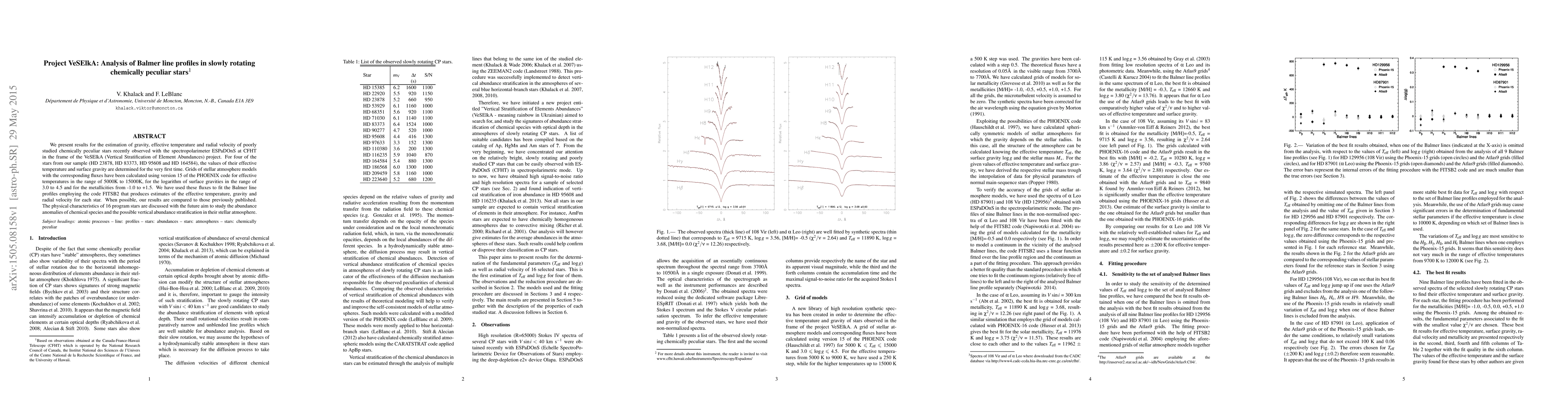 We present results for the estimation of gravity, effective temperature, and radial velocity of poorly studied chemically peculiar stars recently observed with the spectropolarimeter Echelle SpectroPolarimetric Device for Observations of Stars at the Canada-France-Hawaii Telescope in the frame of the Vertical Stratification of Element Abundances project. The effective temperature and surface gravity values are determined for the very first time for four of the stars from our sample (HD23878, HD83373, HD95608, and HD164584). Grids of stellar atmosphere models with the corresponding fluxes have been calculated using version 15 of the PHOENIX code for effective temperatures in the range of 5000-15,000 K, for the logarithm of surface gravities in the range of 3.0-4.5 and for the metallicities from -1.0 to +1.5. We used these fluxes to fit the Balmer line profiles employing the code FITSB2 that produces estimates of the effective temperature, gravity, and radial velocity for each star. When possible, our results are compared to those previously published. The physical characteristics of 16 program stars are discussed with the future aim to study the abundance anomalies of chemical species and the possible vertical abundance stratification in their stellar atmosphere.