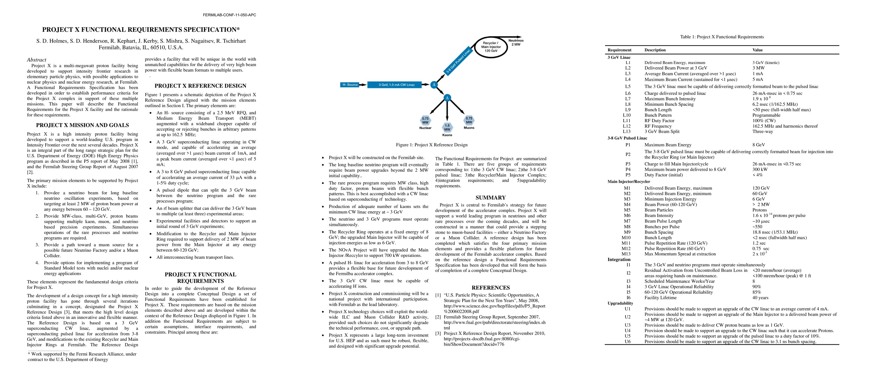 This paper outlines the Functional Requirements Specification for Project X, a multi-megawatt proton facility at Fermilab, aimed at supporting research in elementary particle physics and its applications in nuclear physics and nuclear energy research. It details the performance criteria established to meet the complex needs of these missions.